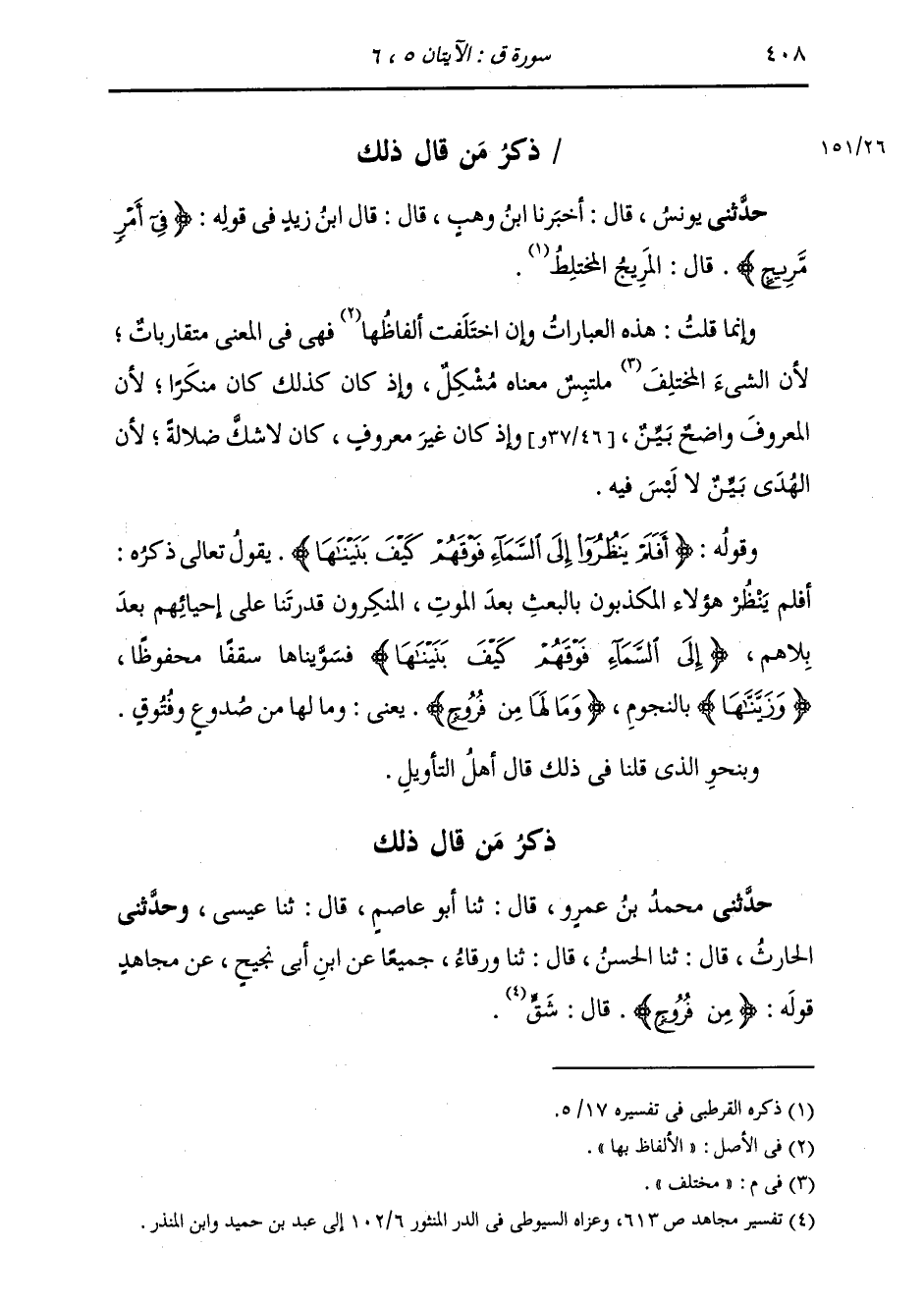 ذِكْرُ مَنْ قَالَ ذَلِكَ: حَدَّثَنِي مُحَمَّدُ بْنُ عَمْرٍو قَالَ: ثَنَا أَبُو عَاصِمٍ قَالَ: ثَنَا عِيسَى، وَحَدَّثَنِي الْحَارِثُ قَالَ: ثَنَا الْحَسَنُ قَالَ: ثَنَا وَرْقَاءُ، جَمِيعًا، عَنِ ابْنِ أَبِي نَجِيحٍ، عَنْ مُجَاهِدٍ، قَوْلَهُ: {§مِنْ فُرُوجٍ} [ق: 6] قَالَ: «شَقٌّ»