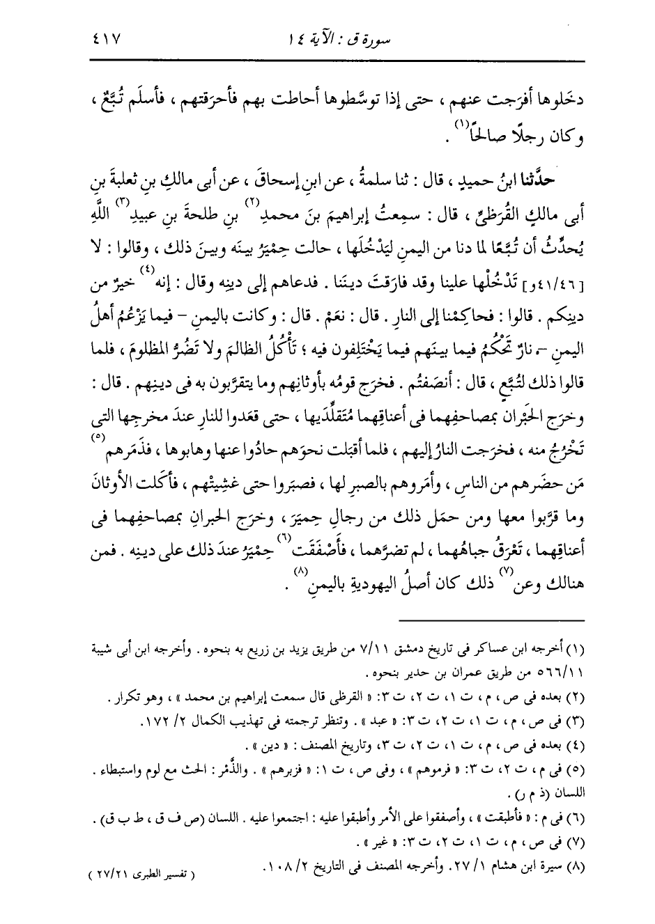 حَدَّثَنَا ابْنُ حُمَيْدٍ قَالَ: ثَنَا سَلَمَةُ، عَنِ ابْنِ إِسْحَاقَ، عَنْ أَبِي مَالِكِ بْنِ ثَعْلَبَةَ بْنِ أَبِي مَالِكٍ الْقُرَظِيِّ قَالَ: سَمِعْتُ إِبْرَاهِيمَ بْنَ مُحَمَّدٍ الْقُرَظِيَّ قَالَ: سَمِعْتُ إِبْرَاهِيمَ بْنَ مُحَمَّدِ بْنِ طَلْحَةَ بْنِ عَبْدِ اللَّهِ، يُحَدِّثُ " أَنَّ §تُبَّعًا، لَمَّا دَنَا مِنَ الْيَمَنِ لِيَدْخُلَهَا، حَالَتْ حِمْيَرُ بَيْنَهُ وَبَيْنَ ذَلِكَ، وَقَالُوا: لَا تَدْخُلْهَا عَلَيْنَا، وَقَدْ فَارَقْتَ دِينَنَا فَدَعَاهُمْ إِلَى دِينِهِ، وَقَالَ: إِنَّهُ دِينٌ خَيْرٌ مِنْ دِينِكُمْ، قَالُوا: فَحَاكِمْنَا إِلَى النَّارِ قَالَ: نَعَمْ قَالَ: وَكَانَتْ فِي الْيَمَنِ فِيمَا يَزْعُمُ أَهْلُ الْيَمَنِ نَارٌ تَحْكُمُ فِيمَا بَيْنَهُمْ فِيمَا يَخْتَلِفُونَ فِيهِ، تَأْكُلُ الظَّالِمَ وَلَا تَضُرُّ الْمَظْلُومَ، فَلَمَّا قَالُوا ذَلِكَ لِتُبَّعٍ قَالَ: أَنْصَفْتُمْ، فَخَرَجَ قَوْمُهُ بِأَوْثَانِهِمْ، وَمَا يَتَقَرَّبُونَ بِهِ فِي دِينِهِمْ قَالَ: وَخَرَجَ الْحَبْرَانِ بِمَصَاحِفِهِمَا فِي أَعْنَاقِهِمَا مُتَقَلِّدَيْهِمَا، حَتَّى قَعَدُوا لِلنَّارِ عِنْدَ مَخْرَجِهَا الَّتِي تَخْرُجُ مِنْهُ، فَخَرَجَتِ النَّارُ إِلَيْهِمْ، فَلَمَّا أَقْبَلَتْ نَحْوَهُمْ حَادُوا عَنْهَا وَهَابُوهَا، فَرَمَوْهُمْ مَنْ حَضَرَهُمْ مِنَ النَّاسِ وَأَمَرُوهُمْ بِالصَّبِرِ لَهَا، فَصَبَرُوا حَتَّى غَشِيَتْهُمْ فَأَكَلَتِ الْأَوْثَانَ وَمَا قَرَّبُوا مَعَهَا، وَمَنْ حَمَلَ ذَلِكَ مِنْ رِجَالِ حِمْيَرَ وَخَرَجَ الْحَبْرَانِ بِمَصَاحِفِهِمَا فِي أَعْنَاقِهِمَا، تَعْرَقُ جِبَاهُهُمَا لَمْ تَضُرُّهُمَا، فَأَطْبَقَتْ حِمْيَرُ، عِنْدَ ذَلِكَ عَلَى دِينِهِ، فَمِنْ هُنَالِكَ وَغَيْرِ ذَلِكَ كَانَ أَصْلُ الْيَهُودِيَّةِ بِالْيَمَنِ "