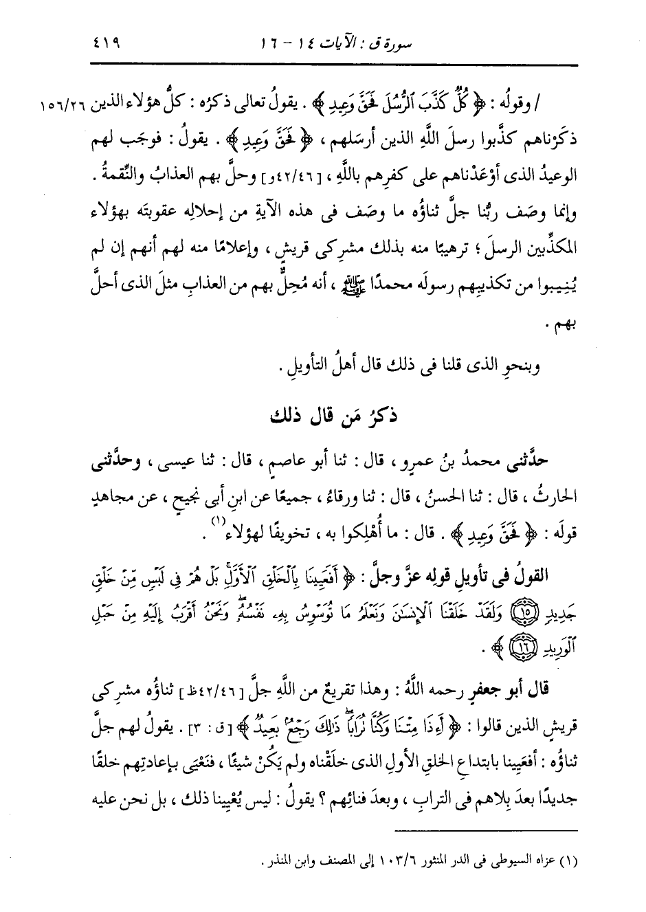 ذِكْرُ مَنْ قَالَ ذَلِكَ: حَدَّثَنِي مُحَمَّدُ بْنُ عَمْرٍو قَالَ: ثَنَا أَبُو عَاصِمٍ قَالَ: ثَنَا عِيسَى، وَحَدَّثَنِي الْحَارِثُ قَالَ: ثَنَا الْحَسَنُ قَالَ: ثَنَا وَرْقَاءُ، جَمِيعًا، عَنِ ابْنِ أَبِي نَجِيحٍ، عَنْ مُجَاهِدٍ، قَوْلَهُ: {§فَحَقَّ وَعِيدِ} [ق: 14] قَالَ: «مَا أُهْلِكُوا بِهِ تَخْوِيفًا لِهَؤُلَاءِ»