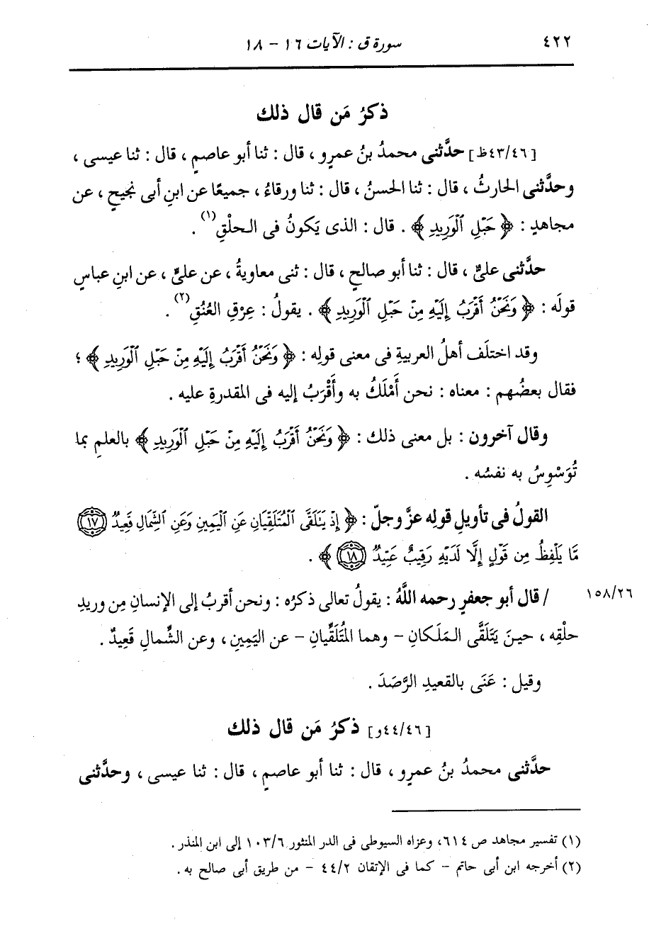 حَدَّثَنِي مُحَمَّدُ بْنُ عَمْرٍو قَالَ: ثَنَا أَبُو عَاصِمٍ قَالَ: ثَنَا عِيسَى، وَحَدَّثَنِي الْحَارِثُ قَالَ: ثَنَا الْحَسَنُ قَالَ: ثَنَا وَرْقَاءُ، جَمِيعًا، عَنِ ابْنِ أَبِي نَجِيحٍ، عَنْ مُجَاهِدٍ، {§حَبْلِ الْوَرِيدِ} [ق: 16] قَالَ: الَّذِي يَكُونُ فِي الْحَلْقِ "