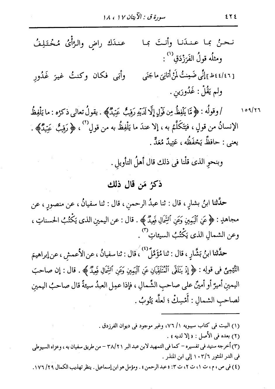 ذِكْرُ مَنْ قَالَ ذَلِكَ: حَدَّثَنَا ابْنُ بَشَّارٍ قَالَ: ثَنَا عَبْدُ الرَّحْمَنِ قَالَ: ثَنَا سُفْيَانُ، عَنْ مَنْصُورٍ، عَنْ مُجَاهِدٍ، {§عَنِ الْيَمِينِ، وَعَنِ الشِّمَالِ، قَعِيدٌ} [ق: 17] قَالَ: «عَنِ الْيَمِينِ الَّذِي، يَكْتُبُ الْحَسَنَاتِ، وَعَنِ الشِّمَالِ الَّذِي، يَكْتُبُ السَّيِّئَاتِ»