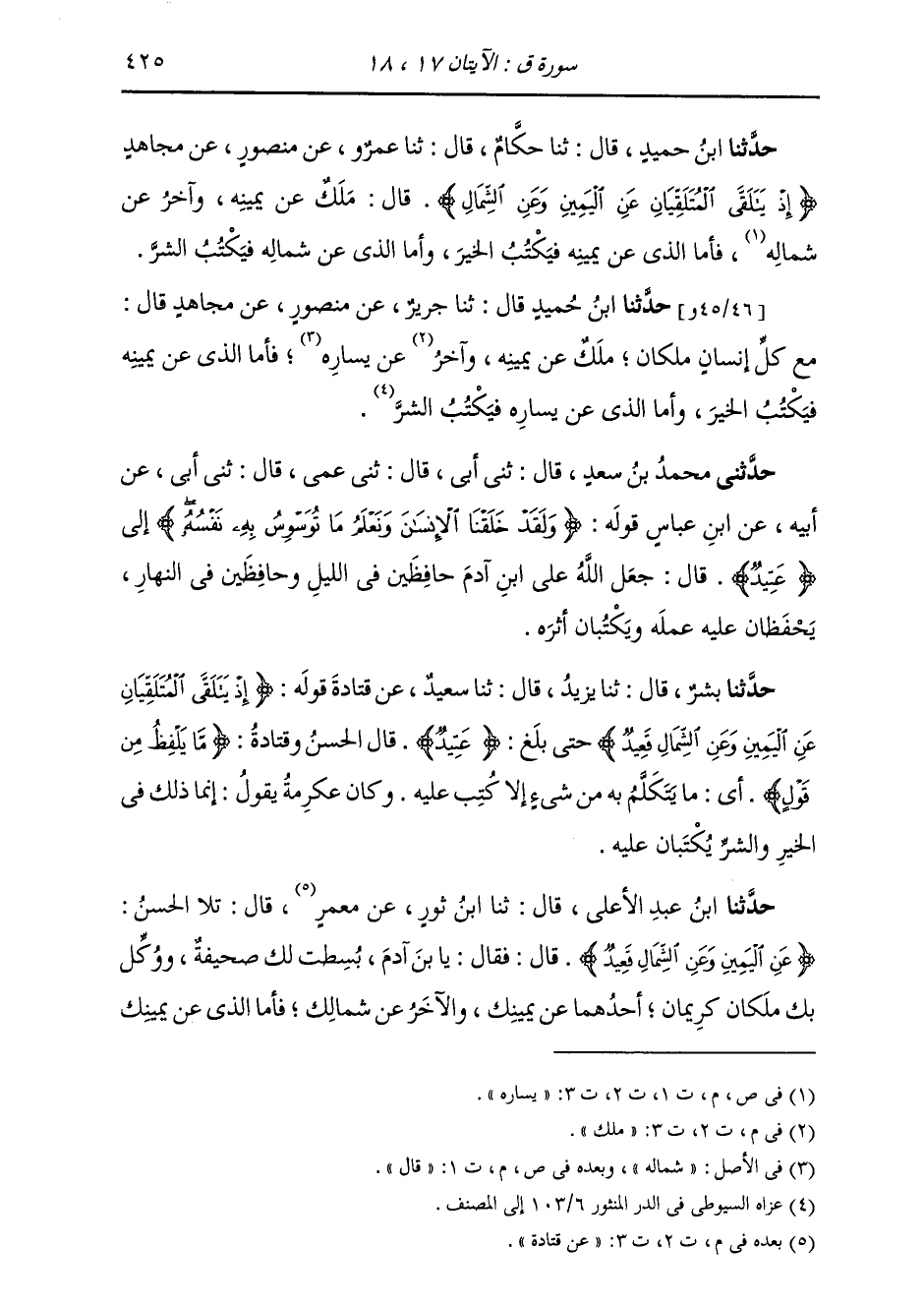 حَدَّثَنَا ابْنُ حُمَيْدٍ قَالَ: ثَنَا حَكَّامٌ قَالَ: ثَنَا عَمْرٌو، عَنْ مَنْصُورٍ، عَنْ مُجَاهِدٍ {§إِذْ يَتَلَقَّى الْمُتَلَقِّيَانِ عَنِ الْيَمِينِ وَعَنِ الشِّمَالِ قَعِيدٌ} [ق: 17] قَالَ «مَلَكٌ عَنْ يَمِينِهِ، وَآخَرُ عَنْ يَسَارِهِ، فَأَمَّا الَّذِي عَنْ يَمِينِهِ فَيَكْتُبُ الْخَيْرَ، وَأَمَّا الَّذِي عَنْ شِمَالِهِ فَيَكْتُبُ الشَّرَّ»