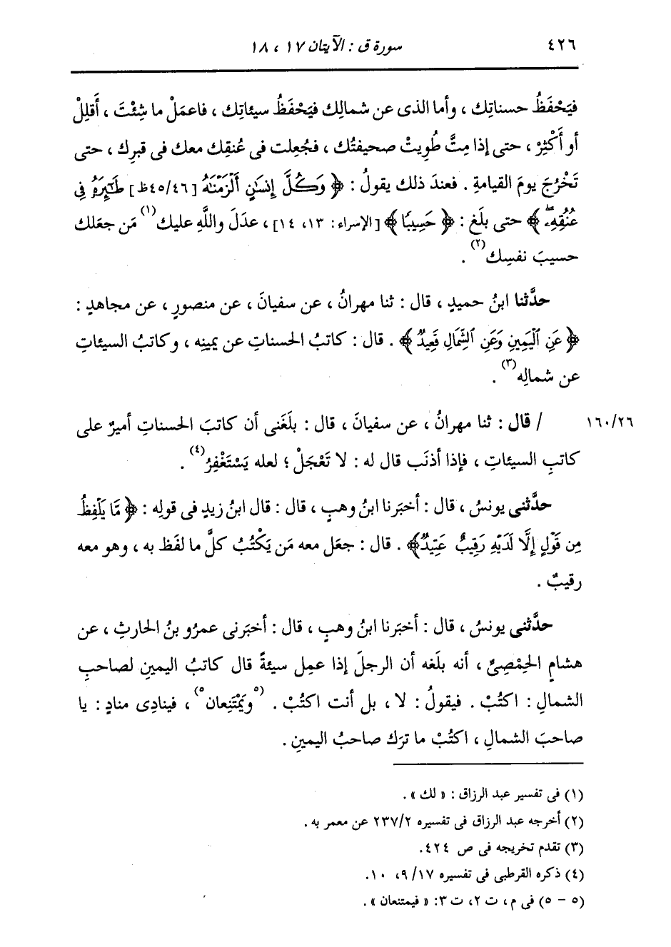 حَدَّثَنَا ابْنُ حُمَيْدٍ قَالَ: ثَنَا مِهْرَانُ، عَنْ سُفْيَانَ، عَنْ مَنْصُورٍ، عَنْ مُجَاهِدٍ {§عَنِ الْيَمِينِ وَعَنِ الشِّمَالِ قَعِيدٌ} [ق: 17] قَالَ: «كَاتِبُ الْحَسَنَاتِ عَنْ يَمِينِهِ، وَكَاتِبُ السَّيِّئَاتِ عَنْ شِمَالِهِ»