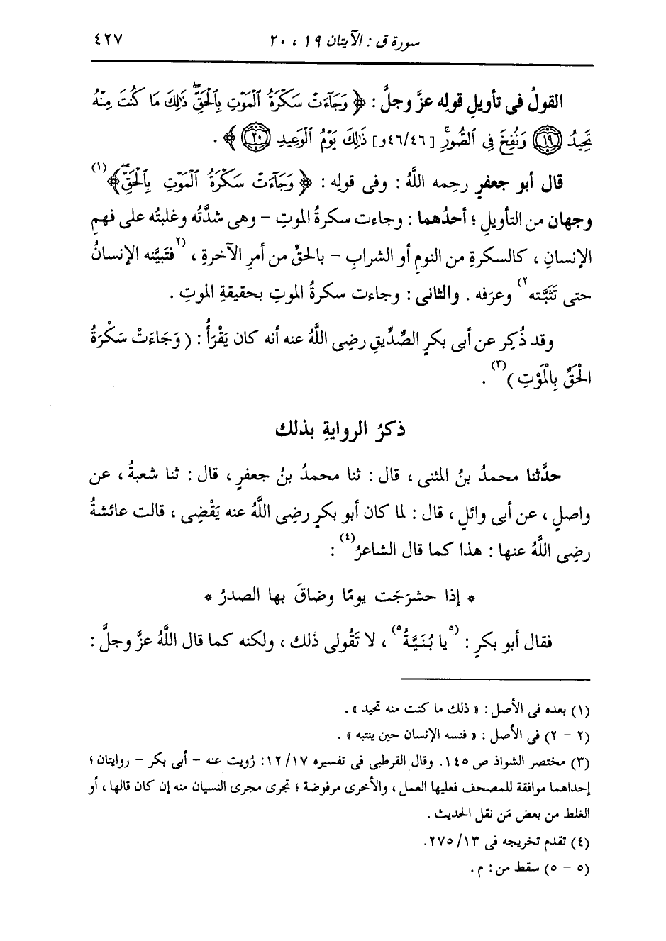 §وَفِي قَوْلِهِ {وَجَاءتْ سَكْرَةُ الْمَوْتِ بِالْحَقِّ} [ق: 19] وَجْهَانِ مِنَ التَّأْوِيلَ، أَحَدُهُمَا: وَجَاءَتْ سَكْرَةُ الْمَوْتِ وَهِيَ شِدَّتُهُ وَغَلَبَتْهُ عَلَى فَهْمِ الْإِنْسَانِ، كَالسَّكْرَةِ مِنَ النَّوْمِ أَوِ الشَّرَابِ بِالْحَقِّ مِنْ أَمْرِ الْآخِرَةِ، فَتَبَيَّنَهُ الْإِنْسَانُ حَتَّى تَثَبَّتَهُ وَعَرَفَهُ وَالثَّانِي: وَجَاءَتْ سَكْرَةُ الْمَوْتِ بِحَقِيقَةِ الْمَوْتِ وَقَدْ ذُكِرَ عَنْ أَبِي بَكْرٍ الصِّدِّيقِ رَضِيَ اللَّهُ عَنْهُ أَنَّهُ كَانَ يَقْرَأُ «وَجَاءَتْ سَكْرَةُ الْحَقِّ بِالْمَوْتِ»