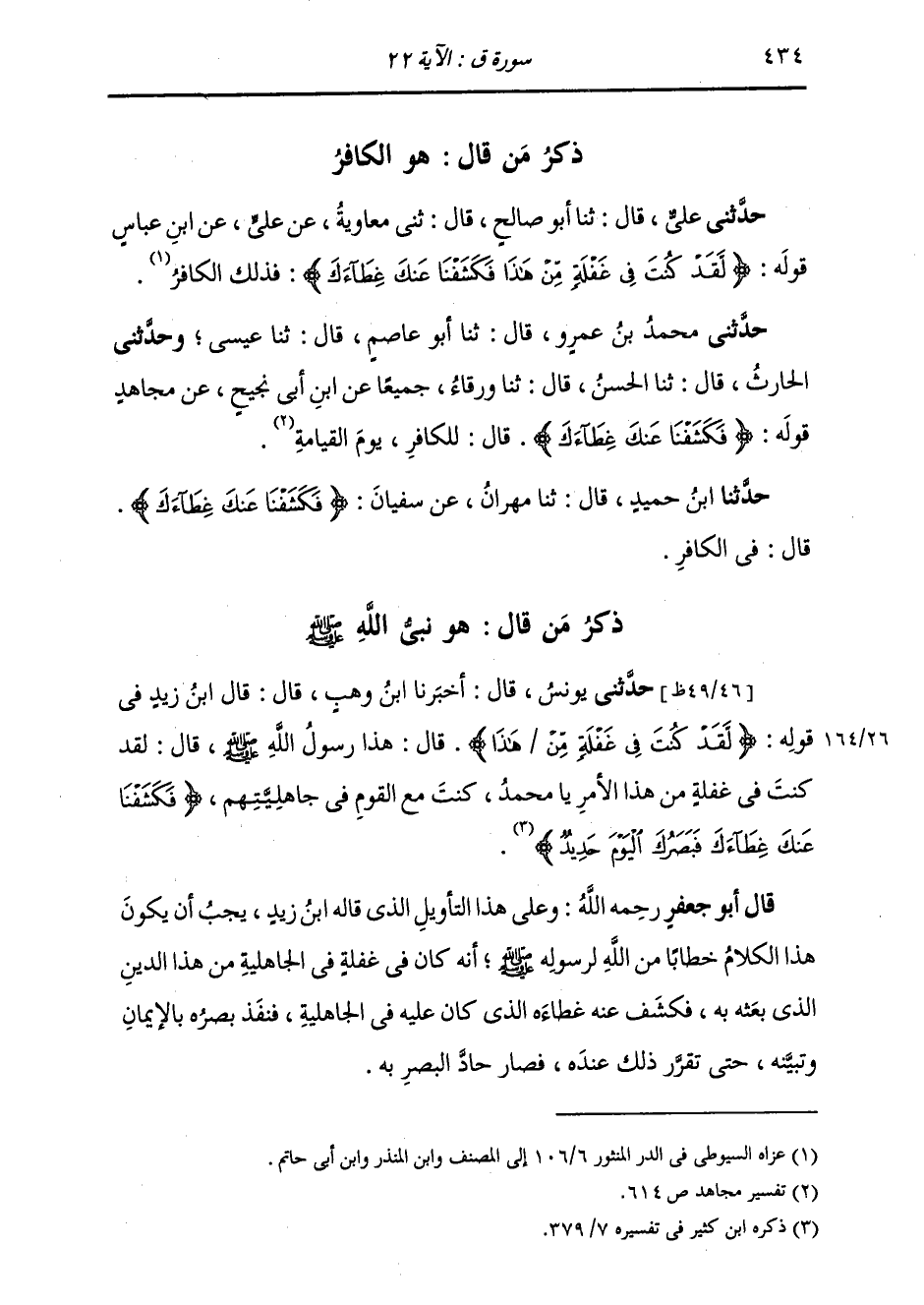 ذِكْرُ مَنْ قَالَ: هُوَ الْكَافِرُ حَدَّثَنِي عَلِيُّ قَالَ: ثَنَا أَبُو صَالِحٍ قَالَ: ثَنِي مُعَاوِيَةُ، عَنْ عَلِيٍّ، عَنِ ابْنِ عَبَّاسٍ، قَوْلَهُ: {§لَقَدْ كُنْتَ فِي غَفْلَةٍ مِنْ هَذَا فَكَشَفْنَا عَنْكَ غِطَاءَكَ} [ق: 22] «وَذَلِكَ الْكَافِرُ»