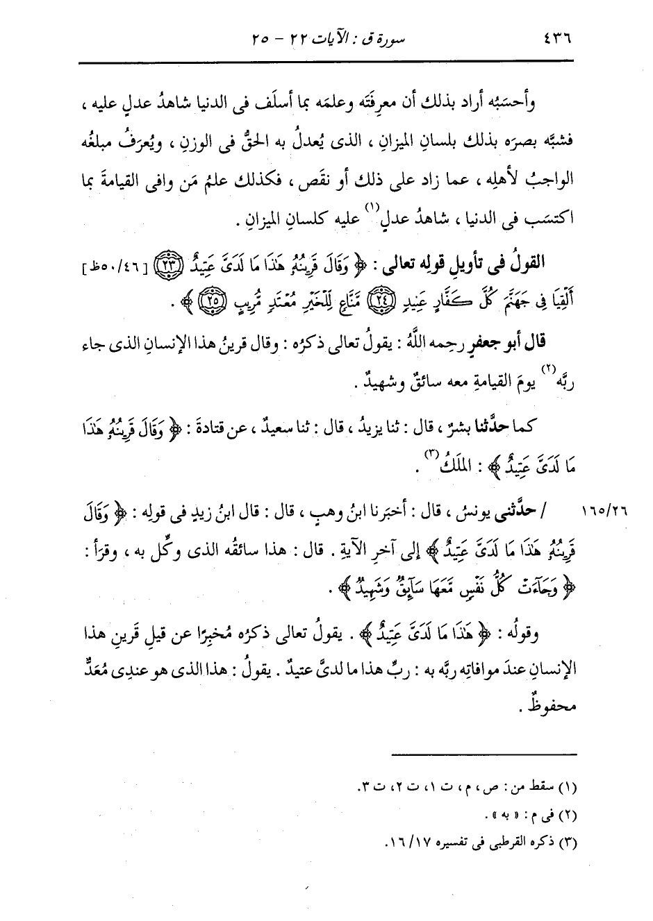 §الْقَوْلُ فِي تَأْوِيلِ قَوْلِهِ تَعَالَى: {وَقَالَ قَرِينُهُ هَذَا مَا لَدَيَّ عَتِيدٌ أَلْقِيَا فِي جَهَنَّمَ كُلَّ كَفَّارٍ عَنِيدٍ مَنَّاعٍ لِّلْخَيْرِ مُعْتَدٍ مُّرِيبٍ} [ق: 24] يَقُولُ تَعَالَى ذِكْرُهُ: وَقَالَ قَرِينُ هَذَا الْإِنْسَانِ الَّذِي جَاءَ بِهِ يَوْمَ الْقِيَامَةِ مَعَهُ سَائِقٌ وَشَهِيدٌ وَبِنَحْوِ الَّذِي قُلْنَا فِي ذَلِكَ قَالَ أَهْلُ التَّأْوِيلِ