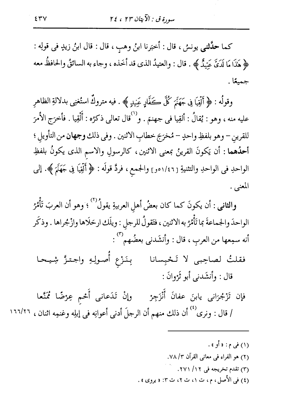 §وَقَوْلُهُ: {أَلْقِيَا فِي جَهَنَّمَ كُلَّ كُفَّارٍ عَنِيدٍ} [ق: 24] فِيهِ مَتْرُوكٌ اسْتُغْنِيَ بِدِلَالَةِ الظَّاهِرِ عَلَيْهِ مِنْهُ، وَهُوَ: يُقَالُ أَلْقِيَا فِي جَهَنَّمَ، أَوْ قَالَ تَعَالَى: أَلْقِيَا، فَأَخْرَجَ الْأَمْرَ لِلْقَرِينِ، وَهُوَ بِلَفْظِ وَاحِدٍ مَخْرَجَ خِطَابِ الِاثْنَيْنِ وَفِي ذَلِكَ وَجْهَانِ مِنَ التَّأْوِيلِ: أَحَدُهُمَا: أَنْ يَكُونَ الْقَرِينُ بِمَعْنَى الِاثْنَيْنِ، كَالرَّسُولِ، وَالِاسِمُ الَّذِي يَكُونُ بِلَفْظِ الْوَاحِدِ فِي الْوَاحِدِ وَالتَّثْنِيَةِ وَالْجَمْعِ، فَرَدَّ قَوْلَهُ: {أَلْقِيَا فِي جَهَنَّمَ} [ق: 24] إِلَى الْمَعْنَى وَالثَّانِي: أَنْ يَكُونَ كَمَا كَانَ بَعْضُ أَهْلِ الْعَرَبِيَّةِ يَقُولُ، وَهُوَ أَنَّ الْعَرَبَ تَأْمُرُ الْوَاحِدَ وَالْجَمَاعَةَ بِمَا تَأْمُرُ بِهِ الِاثْنَيْنِ، فَتَقُولُ لِلرَّجُلِ وَيْلَكَ أَرْحِلَاهَا وَازْجُرَاهَا، وَذَكَرَ أَنَّهُ سَمِعَهَا مِنَ الْعَرَبِ؛ قَالَ: وَأَنْشَدَنِي بَعْضُهُمْ: