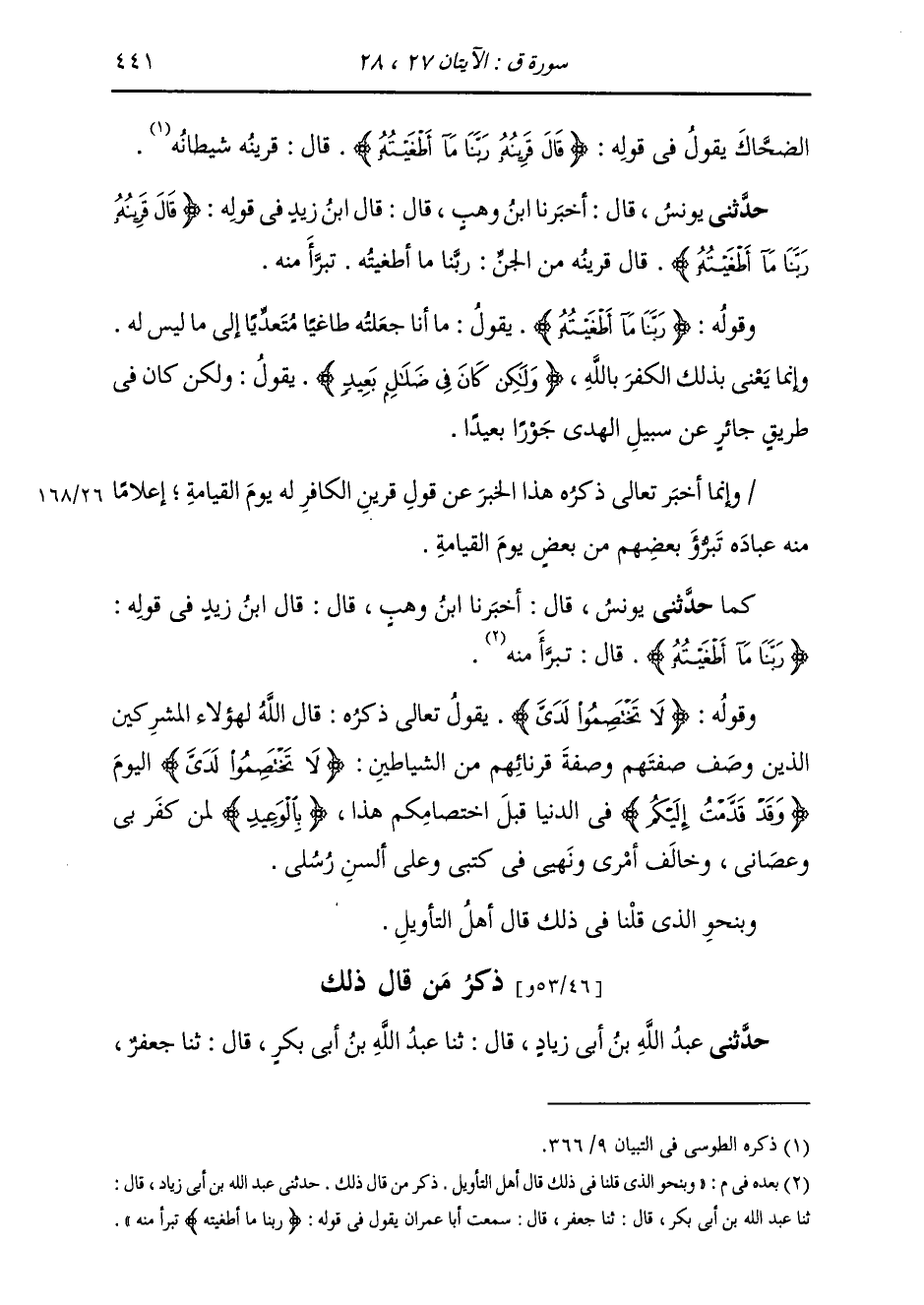 ذِكْرُ مَنْ قَالَ ذَلِكَ: حَدَّثَنِي عَبْدُ اللَّهِ بْنُ أَبِي زِيَادٍ قَالَ: ثَنَا عَبْدُ اللَّهِ بْنُ أَبِي بَكْرٍ قَالَ: ثَنَا جَعْفَرٌ قَالَ: سَمِعْتُ أَبَا عِمْرَانَ، يَقُولُ فِي قَوْلِهِ: {§رَبَّنَا مَا أَطْغَيْتُهُ} [ق: 27] «تَبَرَّأَ مِنْهُ»