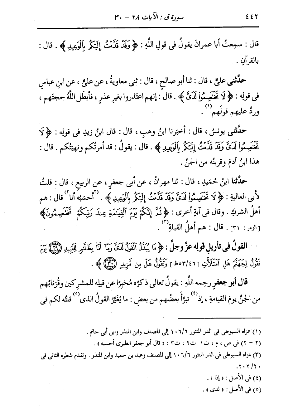حَدَّثَنَا ابْنُ حُمَيْدٍ قَالَ: ثَنَا مِهْرَانُ، عَنْ أَبِي جَعْفَرٍ، عَنِ الرَّبِيعِ قَالَ: قُلْتُ لِأَبِي الْعَالِيَةِ {§لَا تَخْتَصِمُوا لَدَيَّ وَقَدْ قَدَّمْتُ إِلَيْكُمْ بِالْوَعِيدِ} [ق: 28] قَالَ أَبُو جَعْفَرٍ الطَّبَرِيُّ: أَحْسَبُهُ قَالَ: «هُمْ أَهْلُ الشِّرْكِ» وَقَالَ فِي آيَةٍ أُخْرَى {ثُمَّ إِنَّكُمْ يَوْمَ الْقِيَامَةِ عِنْدَ رَبِّكُمْ تَخْتَصِمُونَ} [الزمر: 31] «فَهُمْ أَهْلُ الْقِبْلَةِ»