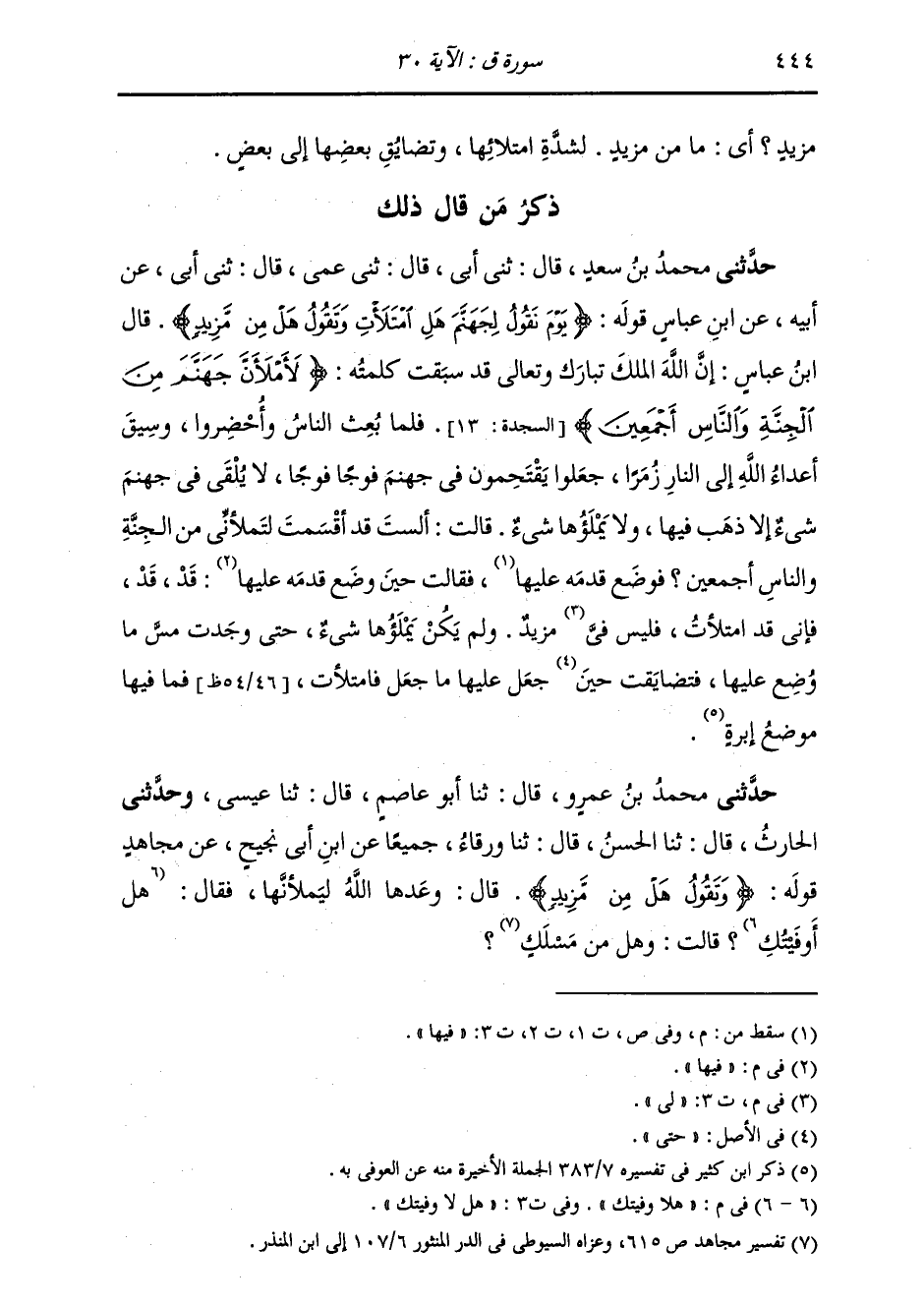 ذِكْرُ مَنْ قَالَ ذَلِكَ: حَدَّثَنِي مُحَمَّدُ بْنُ سَعْدٍ قَالَ: ثَنِي أَبِي قَالَ: ثَنِي عَمِّي قَالَ: ثَنِي أَبِي، عَنْ أَبِيهِ، عَنِ ابْنِ عَبَّاسٍ، قَوْلَهُ: {§يَوْمَ نَقُولُ لِجَهَنَّمَ هَلِ امْتَلَأَتِ وَتَقُولُ هَلْ مِنْ مَزِيدٍ} [ق: 30] قَالَ ابْنُ عَبَّاسٍ: " إِنَّ اللَّهَ الْمَلِكَ تَبَارَكَ وَتَعَالَى قَدْ سَبَقَتْ كَلِمَتُهُ {لَأَمْلَأَنَّ جَهَنَّمَ مِنَ الْجِنَّةِ وَالنَّاسِ أَجْمَعِينَ} [هود: 119] فَلَمَّا بُعِثَ النَّاسُ وَأُحْضِرُوا، وَسِيقَ أَعْدَاءُ اللَّهِ إِلَى النَّارِ زُمَرًا، جَعَلُوا يَقْتَحِمُونَ فِي جَهَنَّمَ فَوْجًا فَوْجًا، لَا يُلْقَى فِي جَهَنَّمَ شَيْءٌ إِلَّا ذَهَبَ فِيهَا، وَلَا يَمْلَأُهَا شَيْءٌ، قَالَتْ: أَلَسْتَ قَدْ أَقْسَمْتَ لَتَمْلَأَنِّي مِنَ الْجِنَّةِ وَالنَّاسِ أَجْمَعِينَ؟ فَوَضَعَ قَدَمَهُ، فَقَالَتْ حِينَ وَضَعَ قَدَمَهُ فِيهَا: قَدِ قَدِ، فَإِنِّي قَدِ امْتَلَأْتُ، فَلَيْسَ لِي مَزِيدٌ، وَلَمْ يَكُنْ يَمْلَأُهَا شَيْءٌ، حَتَّى وَجَدَتْ مَسَّ مَا وَضَعَ عَلَيْهَا، فَتَضَايَقَتْ حِينَ جَعَلَ عَلَيْهَا مَا جَعَلَ، فَامْتَلَأَتْ فَمَا فِيهَا مَوْضِعُ إِبْرَةٍ "