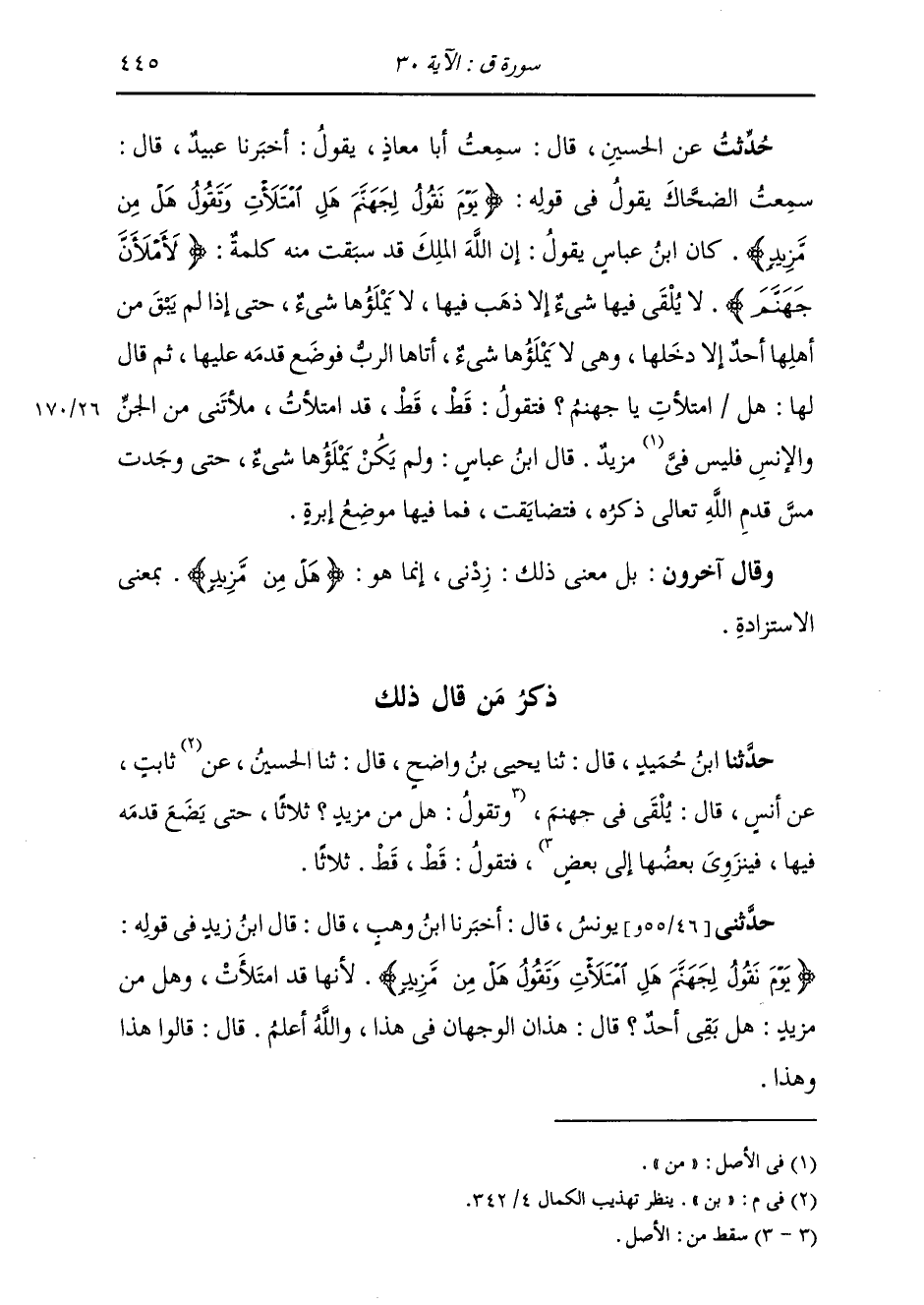حُدِّثْتُ عَنِ الْحُسَيْنِ قَالَ: سَمِعْتُ أَبَا مُعَاذٍ، يَقُولُ: أَخْبَرَنَا عُبَيْدٌ قَالَ: سَمِعْتُ الضَّحَّاكَ يَقُولُ فِي قَوْلِهِ: {§يَوْمَ نَقُولُ لِجَهَنَّمَ هَلِ امْتَلَأَتِ وَتَقُولُ هَلْ مِنْ مَزِيدٍ} [ق: 30] كَانَ ابْنُ عَبَّاسٍ يَقُولُ: " إِنَّ اللَّهَ الْمَلِكَ قَدْ سَبَقَتْ مِنْهُ كَلِمَةٌ {لَأَمْلَأَنَّ جَهَنَّمَ} [السجدة: 13] لَا يُلْقَى فِيهَا شَيْءٌ إِلَّا ذَهَبَ فِيهَا، لَا يَمْلَأُهَا شَيْءٌ، حَتَّى إِذَا لَمْ يَبْقَ مِنْ أَهْلِهَا أَحَدٌ إِلَّا دَخَلَهَا، وَهِيَ لَا يَمْلَأُهَا شَيْءٌ، أَتَاهَا الرَّبُّ فَوَضَعَ قَدَمَهُ عَلَيْهَا، ثُمَّ قَالَ لَهَا: هَلِ امْتَلَأَتِ يَا جَهَنَّمُ؟ فَتَقُولُ: قَطِ قَطِ؛ قَدِ امْتَلَأَتُ، مَلَأْتَنِي مِنَ الْجِنِّ وَالْإِنْسِ فَلَيْسَ فِيَّ مَزِيدٌ "؛ قَالَ ابْنُ عَبَّاسٍ: «وَلَمْ يَكُنْ يَمْلَأُهَا شَيْءٌ حَتَّى وَجَدَتْ مَسَّ قَدَمِ اللَّهِ تَعَالَى ذِكْرُهُ، فَتَضَايَقَتْ، فَمَا فِيهَا مَوْضِعُ إِبْرَةٍ» وَقَالَ آخَرُونَ: بَلْ مَعْنَى ذَلِكَ: زِدْنِي، إِنَّمَا هُوَ هَلْ مِنْ مَزِيدٍ، بِمَعْنَى الِاسْتِزَادَةِ