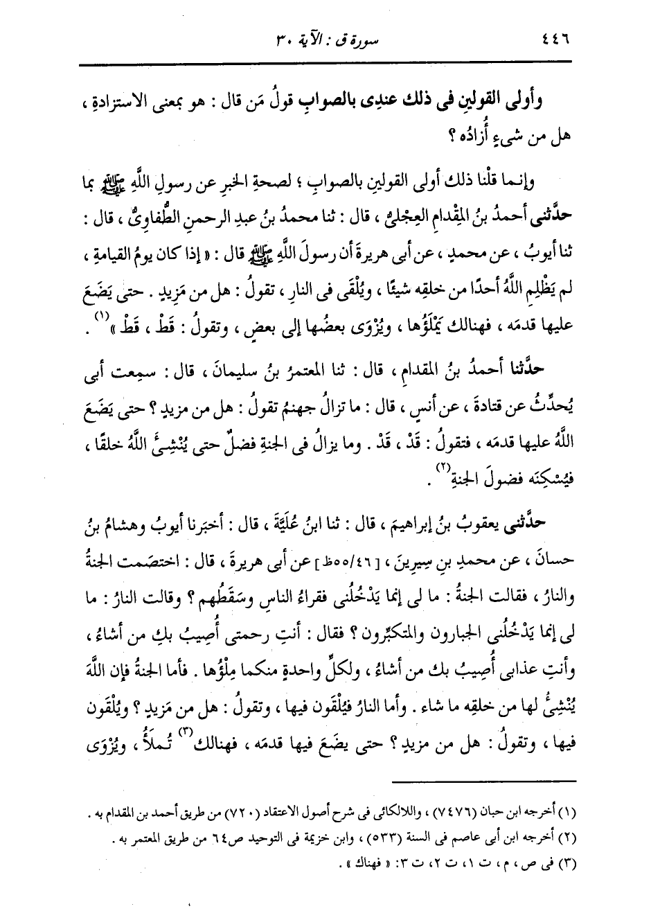 بِمَا: حَدَّثَنِي أَحْمَدُ بْنُ الْمِقْدَامِ الْعِجْلِيُّ قَالَ: ثَنَا مُحَمَّدُ بْنُ عَبْدِ الرَّحْمَنِ الطُّفَاوِيُّ قَالَ: ثَنَا أَيُّوبُ، عَنْ مُحَمَّدٍ، عَنْ أَبِي هُرَيْرَةَ، أَنَّ رَسُولَ اللَّهِ صَلَّى اللهُ عَلَيْهِ وَسَلَّمَ قَالَ: " §إِذَا كَانَ يَوْمُ الْقِيَامَةِ، لَمْ يَظْلِمِ اللَّهُ أَحَدًا مِنْ خَلْقِهِ شَيْئًا، وَيُلْقِي فِي النَّارِ، تَقُولُ هَلْ مِنْ مَزِيدٍ، حَتَّى يَضَعَ عَلَيْهَا قَدَمَهُ، فَهُنَالِكَ يَمْلَأُهَا، وَيُزْوَى بَعْضُهَا إِلَى بَعْضٍ وَتَقُولُ: قَطْ قَطْ "