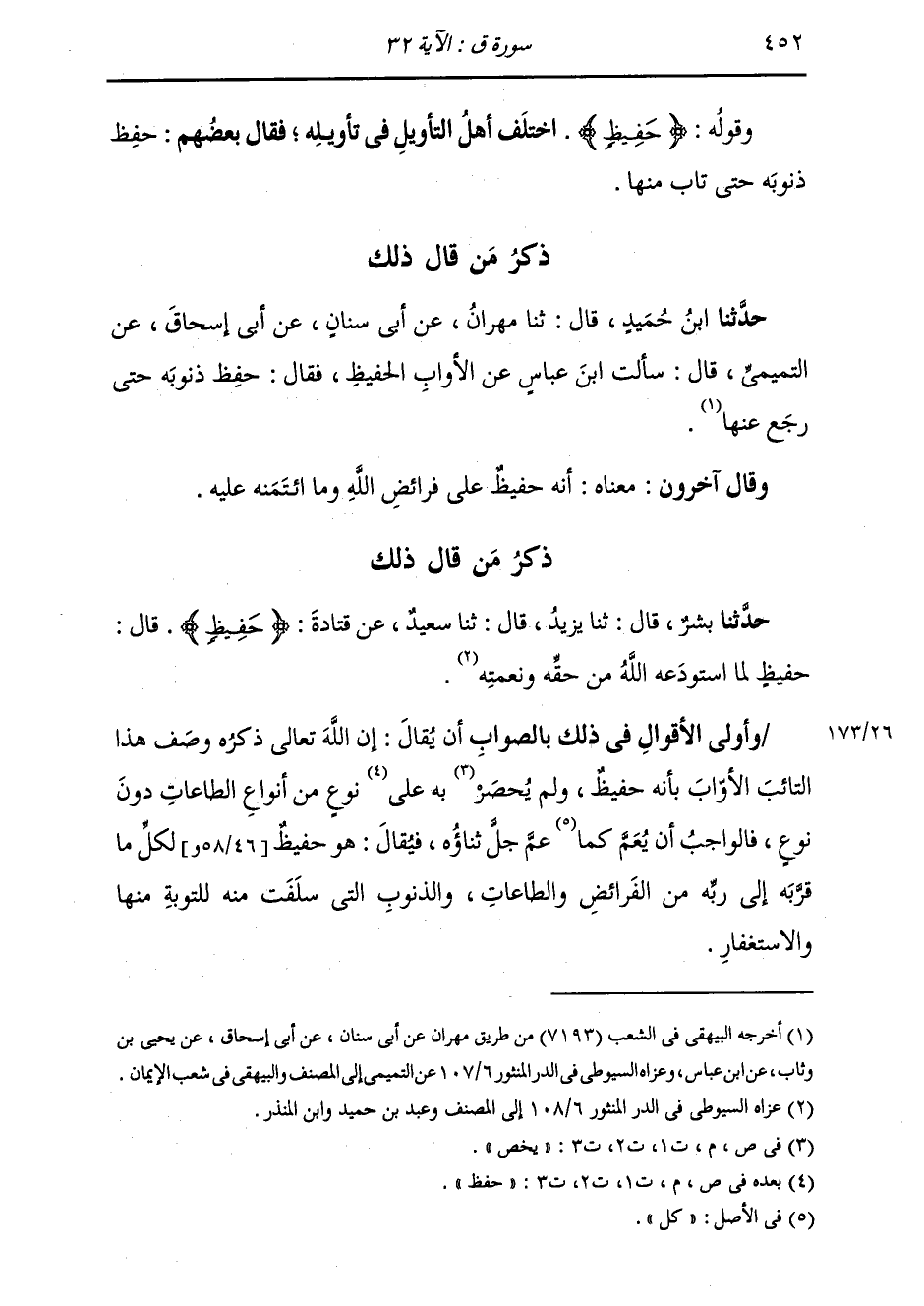 ذِكْرُ مَنْ قَالَ ذَلِكَ: حَدَّثَنَا بِشْرٌ قَالَ: ثَنَا يَزِيدُ قَالَ: ثَنَا سَعِيدٌ، عَنْ قَتَادَةَ، {§حَفِيظٍ} [ق: 32] قَالَ: «حَفِيظٌ لِمَا اسْتَوْدَعَهُ اللَّهُ مِنْ حَقِّهِ وَنِعْمَتِهِ» وَأَوْلَى الْأَقْوَالِ فِي ذَلِكَ بِالصَّوَابِ أَنْ يُقَالَ: إِنَّ اللَّهَ تَعَالَى ذِكْرُهُ وَصَفَ هَذَا التَّائِبَ الْأَوَّابَ بِأَنَّهُ حَفِيظٌ، وَلَمْ يَخُصَّ بِهِ عَلَى حِفْظِ نَوْعٍ مِنْ أَنْوَاعِ الطَّاعَاتِ دُونَ نَوْعٍ، فَالْوَاجِبُ أَنْ يَعُمَّ كَمَا عَمَّ جَلَّ ثَنَاؤُهُ، فَيُقَالَ: هُوَ حَفِيظٌ لِكُلِّ مَا قَرَّبَهُ إِلَى رَبِّهِ مِنَ الْفَرَائِضِ وَالطَّاعَاتِ وَالذُّنُوبِ الَّتِي سَلَفَتْ مِنْهُ لِلتَّوْبَةِ مِنْهَا وَالِاسْتِغْفَارِ