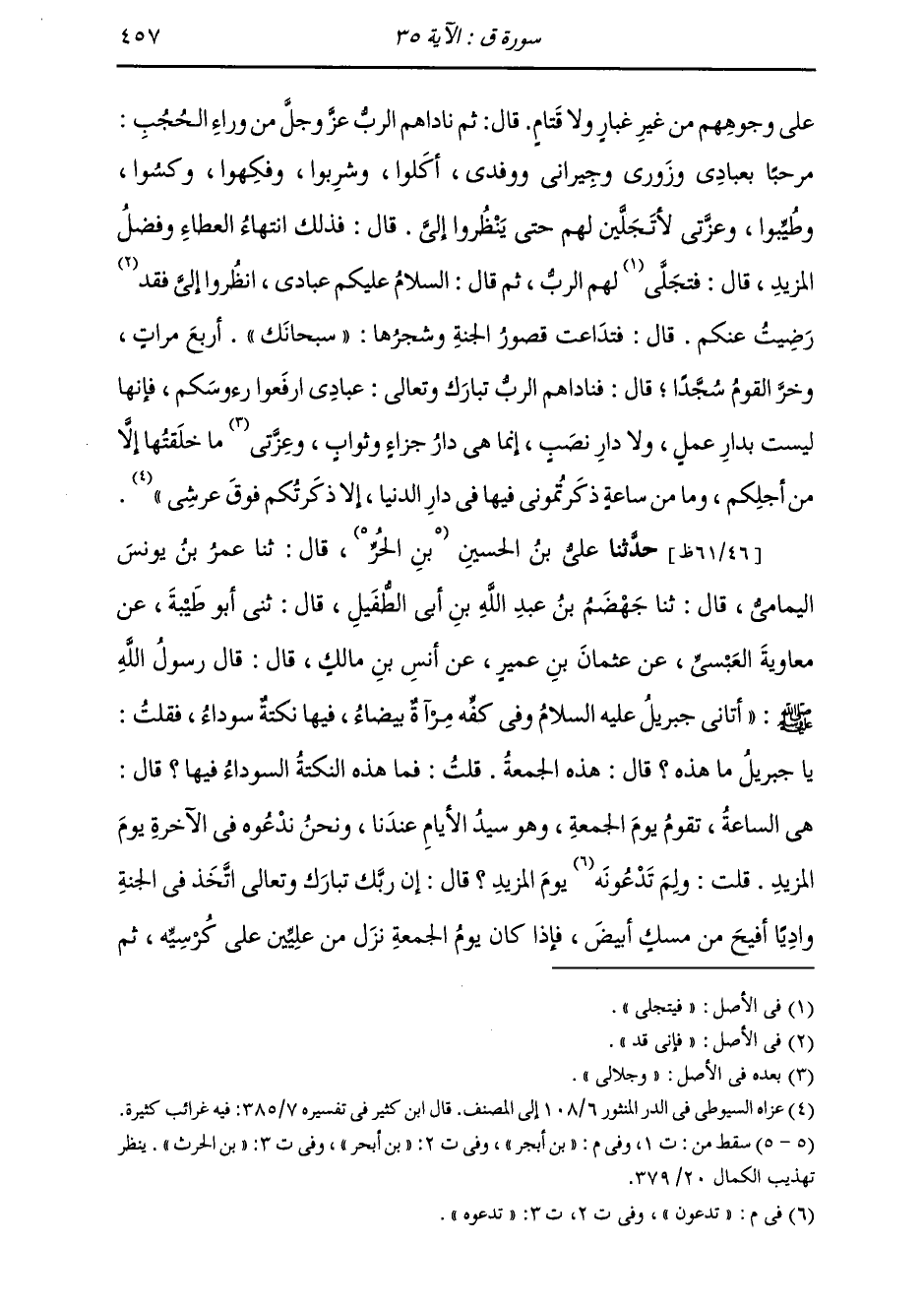 حَدَّثَنَا عَلِيُّ بْنُ الْحُسَيْنِ بْنِ أَبْجَرَ قَالَ: ثَنَا عُمَرُ بْنُ يُونُسَ الْيَمَامِيُّ قَالَ: ثَنَا جَهْضَمُ بْنُ عَبْدِ اللَّهِ بْنِ أَبِي الطُّفَيْلِ قَالَ: ثَنِي أَبُو طَيْبَةَ، عَنْ مُعَاوِيَةَ الْعَبْسِيِّ، عَنْ عُثْمَانَ بْنِ عُمَيْرٍ، عَنْ أَنَسِ بْنِ مَالِكٍ قَالَ: قَالَ رَسُولُ اللَّهِ صَلَّى اللهُ عَلَيْهِ وَسَلَّمَ: أَتَانِي جِبْرِيلُ عَلَيْهِ السَّلَامُ وَفِي كَفِّهِ مِرْآةٌ بَيْضَاءُ، فِيهَا نُكْتَةٌ سَوْدَاءُ فَقُلْتُ: يَا جِبْرِيلُ مَا هَذِهِ؟ قَالَ: هَذِهِ الْجُمُعَةُ، قُلْتُ: فَمَا هَذِهِ النُّكْتَةُ السَّوْدَاءُ فِيهَا؟ قَالَ: هِيَ السَّاعَةُ تَقُومُ يَوْمَ الْجُمُعَةِ وَهُوُ سَيِّدُ الْأَيَّامِ عِنْدَنَا، وَنَحْنُ نَدْعُوهُ فِي الْآخِرَةِ يَوْمَ الْمَزِيدِ؛ قُلْتُ: وَلِمَ تَدْعُونَ يَوْمَ الْمَزِيدِ قَالَ: إِنَّ رَبَّكَ تَبَارَكَ وَتَعَالَى اتَّخَذَ فِي الْجَنَّةِ وَادِيًا أَفْيَحَ مِنْ مِسْكٍ أَبْيَضَ، فَإِذَا كَانَ يَوْمُ الْجُمُعَةِ نَزَلَ مِنْ عِلِّيِّينَ عَلَى كُرْسِيِّهِ، ثُمَّ -[458]- حُفَّ الْكُرْسِيُّ بِمَنَابِرَ مِنْ نُورٍ، ثُمَّ جَاءَ النَّبِيُّونَ حَتَّى يَجْلِسُوا عَلَيْهَا ثُمَّ تَجِيءُ أَهْلُ الْجَنَّةِ حَتَّى يَجْلِسُوا عَلَى الْكُثُبِ فَيَتَجَلَّى لَهُمْ رَبُّهُمْ عَزَّ وَجَلَّ حَتَّى يَنْظُرُوا إِلَى وَجْهِهِ وَهُوَ يَقُولُ: «§أَنَا الَّذِي صَدَقْتُكُمْ عِدَتِي، وَأَتْمَمْتُ عَلَيْكُمْ نِعْمَتِي، فَهَذَا مَحَلُّ كَرَامِتِي، فَسَلُونِي» ، فَيَسْأَلُونَهُ الرِّضَا، فَيَقُولُ: «رِضَايَ أَحَلَّكُمْ دَارِي وَأَنَالَكُمْ كَرَامَتِي، سَلُونِي» ، فَيَسْأَلُونَهُ حَتَّى تَنْتَهِيَ رَغْبَتُهُمْ، فَيُفْتَحُ لَهُمْ عِنْدَ ذَلِكَ مَا لَا عَيْنٌ رَأَتْ، وَلَا أُذُنٌ سَمِعَتْ، وَلَا خَطَرَ عَلَى قَلْبِ بِشْرٍ، إِلَى مِقْدَارِ مُنْصَرَفِ النَّاسِ مِنَ الْجُمُعَةِ حَتَّى يَصْعَدَ عَلَى كُرْسِيِّهِ فَيَصْعَدُ مَعَهُ الصِّدِّيقُونَ وَالشُّهَدَاءُ، وَتَرْجِعُ أَهْلُ الْجَنَّةِ إِلَى غُرَفِهِمْ دُرَّةً بَيْضَاءَ، لَا نَظْمَ فِيهَا وَلَا فَصْمَ، أَوْ يَاقُوتَةً حَمْرَاءَ، أَوْ زَبَرْجَدَةً خَضْرَاءَ، مِنْهَا غُرَفُهَا وَأَبْوَابُهَا، فَلَيْسُوا إِلَى شَيْءٍ أَحْوَجَ مِنْهُمْ إِلَى يَوْمِ الْجُمُعَةِ، لِيَزْدَادُوا مِنْهُ كَرَامَةً، وَلِيَزْدَادُوا نَظَرًا إِلَى وَجْهِهِ، وَلِذَلِكَ دُعِيَ يَوْمَ الْمَزِيدِ حَدَّثَنَا ابْنُ حُمَيْدٍ قَالَ: ثَنَا جَرِيرٌ، عَنْ لَيْثِ بْنِ أَبِي سُلَيْمٍ، عَنْ عُثْمَانَ بْنِ عُمَيْرٍ، عَنْ أَنَسِ بْنِ مَالِكٍ، عَنِ النَّبِيِّ صَلَّى اللهُ عَلَيْهِ وَسَلَّمَ، نَحْوَ حَدِيثِ عَلِيِّ بْنِ الْحُسَيْنِ -[459]- حَدَّثَنَا الرَّبِيعُ بْنُ سُلَيْمَانَ قَالَ: ثَنَا أَسَدُ بْنُ مُوسَى قَالَ: ثَنَا يَعْقُوبُ بْنُ إِبْرَاهِيمَ، عَنْ صَالِحِ بْنِ حَيَّانَ، عَنْ أَبِي بُرَيْدَةَ، عَنْ أَنَسِ بْنِ مَالِكٍ، عَنِ النَّبِيِّ صَلَّى اللهُ عَلَيْهِ وَسَلَّمَ بِنَحْوِهِ