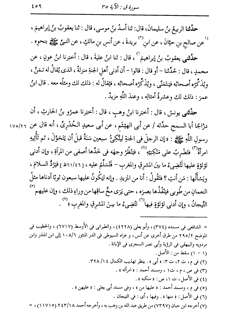 حَدَّثَنِي يُونُسُ قَالَ: أَخْبَرَنَا ابْنُ وَهْبٍ قَالَ: أَخْبَرَنَا عَمْرُو بْنُ الْحَارِثِ، أَنَّ دَرَّاجًا أَبَا السَّمْحِ، حَدَّثَهُ عَنْ أَبِي الْهَيْثَمِ، عَنْ أَبِي سَعِيدٍ الْخُدْرِيِّ، أَنَّهُ قَالَ عَنْ رَسُولِ اللَّهِ صَلَّى اللهُ عَلَيْهِ وَسَلَّمَ: " إِنَّ §الرَّجُلَ فِي الْجَنَّةِ لَيَتَّكِئُ سَبْعِينَ سَنَةً قَبْلَ أَنْ يَتَحَوَّلَ ثُمَّ تَأْتِيهِ امْرَأَتُهُ فَتَضْرِبُ عَلَى مَنْكِبَيْهِ، فَيَنْظُرُ وَجْهَهُ فِي خَدِّهَا أَصْفَى مِنَ الْمِرْآةِ، وَإِنَّ أَدْنَى لُؤْلُؤَةٍ عَلَيْهَا لَتُضِيءُ مَا بَيْنَ الْمَشْرِقِ وَالْمَغْرِبِ، فَتُسَلِّمُ عَلَيْهِ، فَيَرُدُّ السَّلَامَ، وَيَسْأَلُهَا مَنْ أَنْتِ؟ فَتَقُولُ: أَنَا مِنَ الْمَزِيدِ وَإِنَّهُ لَيَكُونُ عَلَيْهَا سَبْعُونَ ثَوْبًا أَدْنَاهَا مِثْلُ النُّعْمَانِ مِنْ طُوبَى فَيَنْفُذُهَا بَصَرُهُ حَتَّى يَرَى مُخَّ سَاقِهَا مِنْ وَرَاءِ ذَلِكَ، وَإِنَّ عَلَيْهَا مِنَ التِّيجَانِ، وَإِنَّ أَدْنَى لُؤْلُؤَةٍ فِيهَا لَتُضِيءُ مَا بَيْنَ الْمَشْرِقِ وَالْمَغْرِبِ "