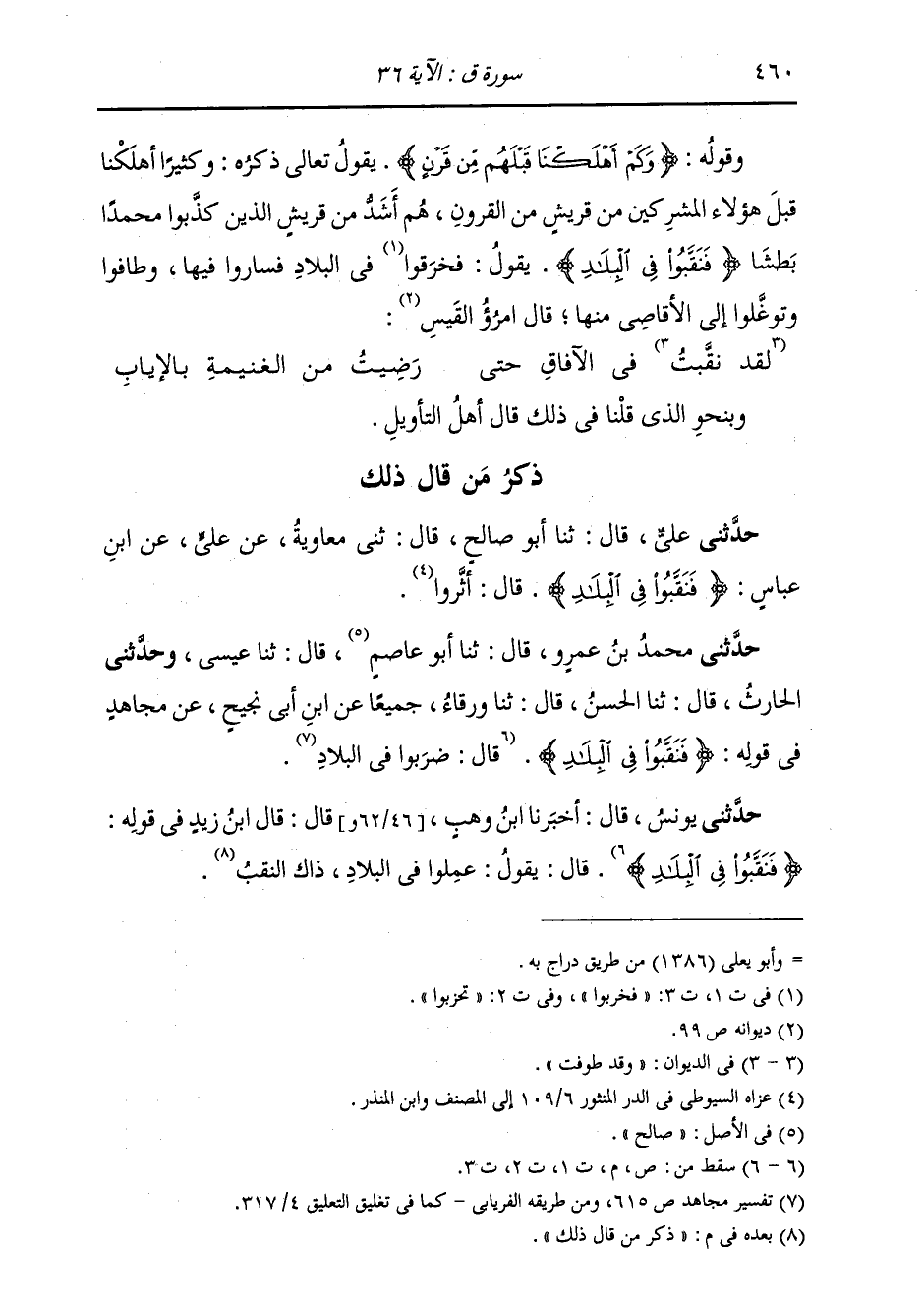ذِكْرُ مَنْ قَالَ ذَلِكَ: حَدَّثَنِي عَلِيُّ قَالَ: ثَنَا أَبُو صَالِحٍ قَالَ: ثَنِي مُعَاوِيَةُ، عَنْ عَلِيٍّ، عَنِ ابْنِ عَبَّاسٍ، {§فَنَقَّبُوا فِي الْبِلَادِ} [ق: 36] قَالَ: «أَثَّرُوا»