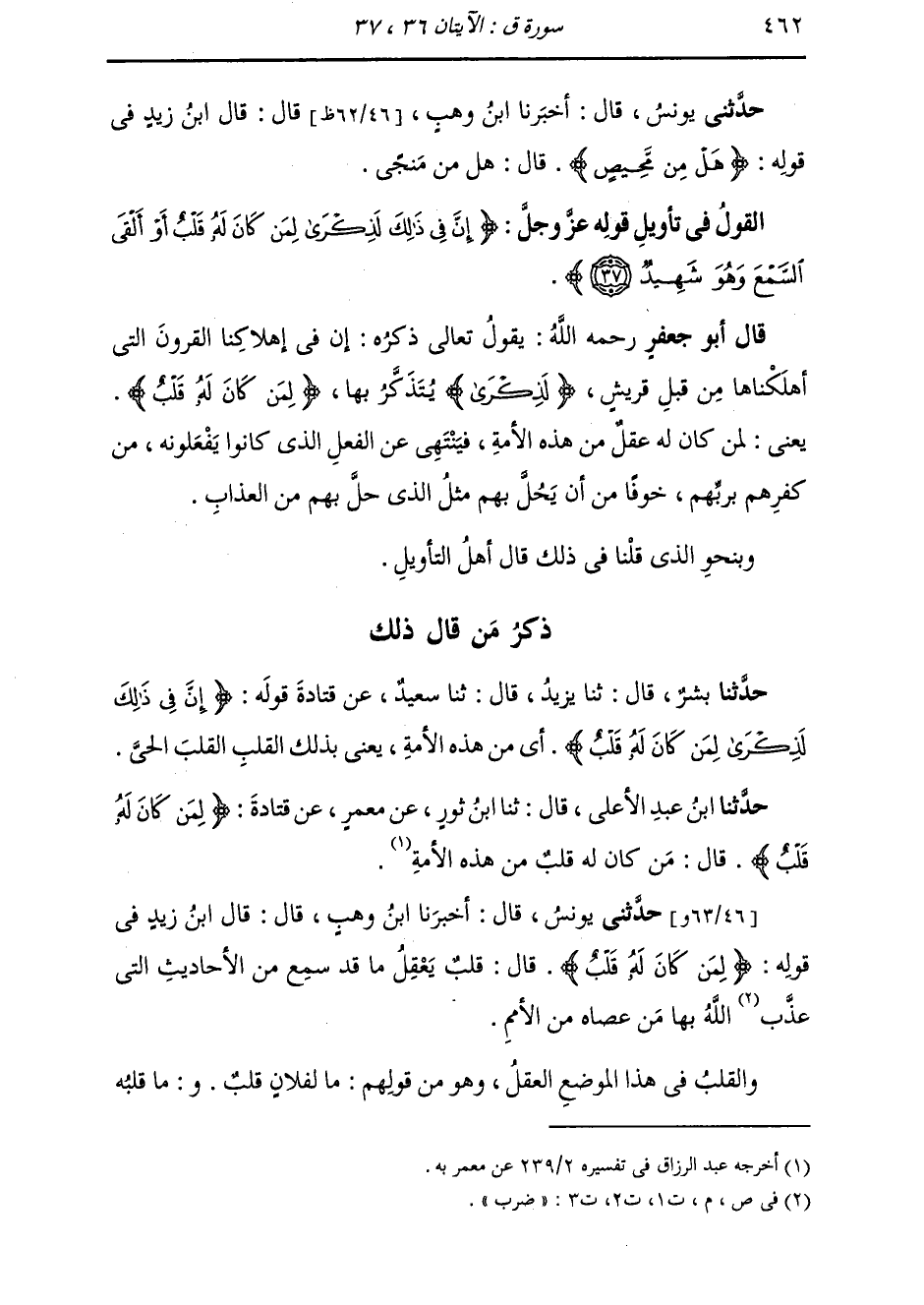 حَدَّثَنِي يُونُسُ قَالَ: أَخْبَرَنَا ابْنُ وَهْبٍ قَالَ: قَالَ ابْنُ زَيْدٍ، فِي قَوْلِهِ: {§لِمَنْ كَانَ لَهُ قَلْبٌ} [ق: 37] قَالَ: «قَلْبٌ يَعْقِلُ مَا قَدْ سَمِعَ مِنَ الْأَحَادِيثِ الَّتِي ضَرَبَ اللَّهُ بِهَا مَنْ عَصَاهُ مِنَ الْأُمَمِ» وَالْقَلْبُ فِي هَذَا الْمَوْضِعِ: الْعَقْلُ وَهُوَ مِنْ قَوْلِهِمْ: مَا لِفُلَانٍ قَلْبٌ، وَمَا قَلْبُهُ -[463]- مَعَهُ: أَيْ مَا عَقْلُهُ مَعَهُ وَأَيْنَ ذَهَبَ قَلْبُكَ؟ يَعْنِي أَيْنَ ذَهَبَ عَقْلُكَ