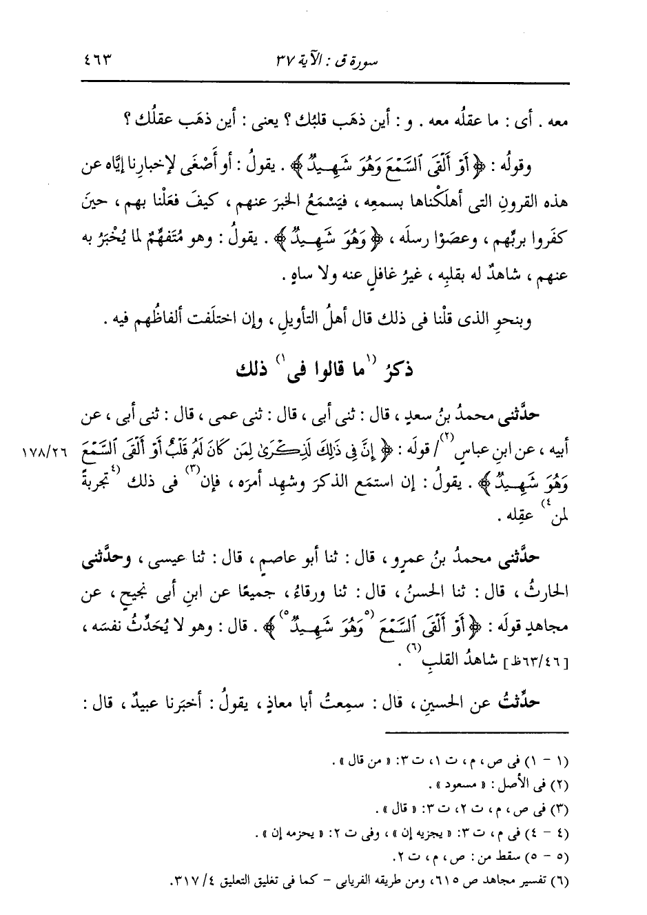 حَدَّثَنِي مُحَمَّدُ بْنُ عَمْرٍو قَالَ: ثَنَا أَبُو عَاصِمٍ قَالَ: ثَنَا عِيسَى، وَحَدَّثَنِي الْحَارِثُ قَالَ: ثَنَا الْحَسَنُ قَالَ: ثَنَا وَرْقَاءُ، جَمِيعًا، عَنِ ابْنِ أَبِي نَجِيحٍ، عَنْ مُجَاهِدٍ، قَوْلَهُ: {§أَوْ أَلْقَى السَّمْعَ} [ق: 37] قَالَ: «وَهُوَ لَا يُحَدِّثُ نَفْسَهُ، شَاهِدُ الْقَلْبِ»