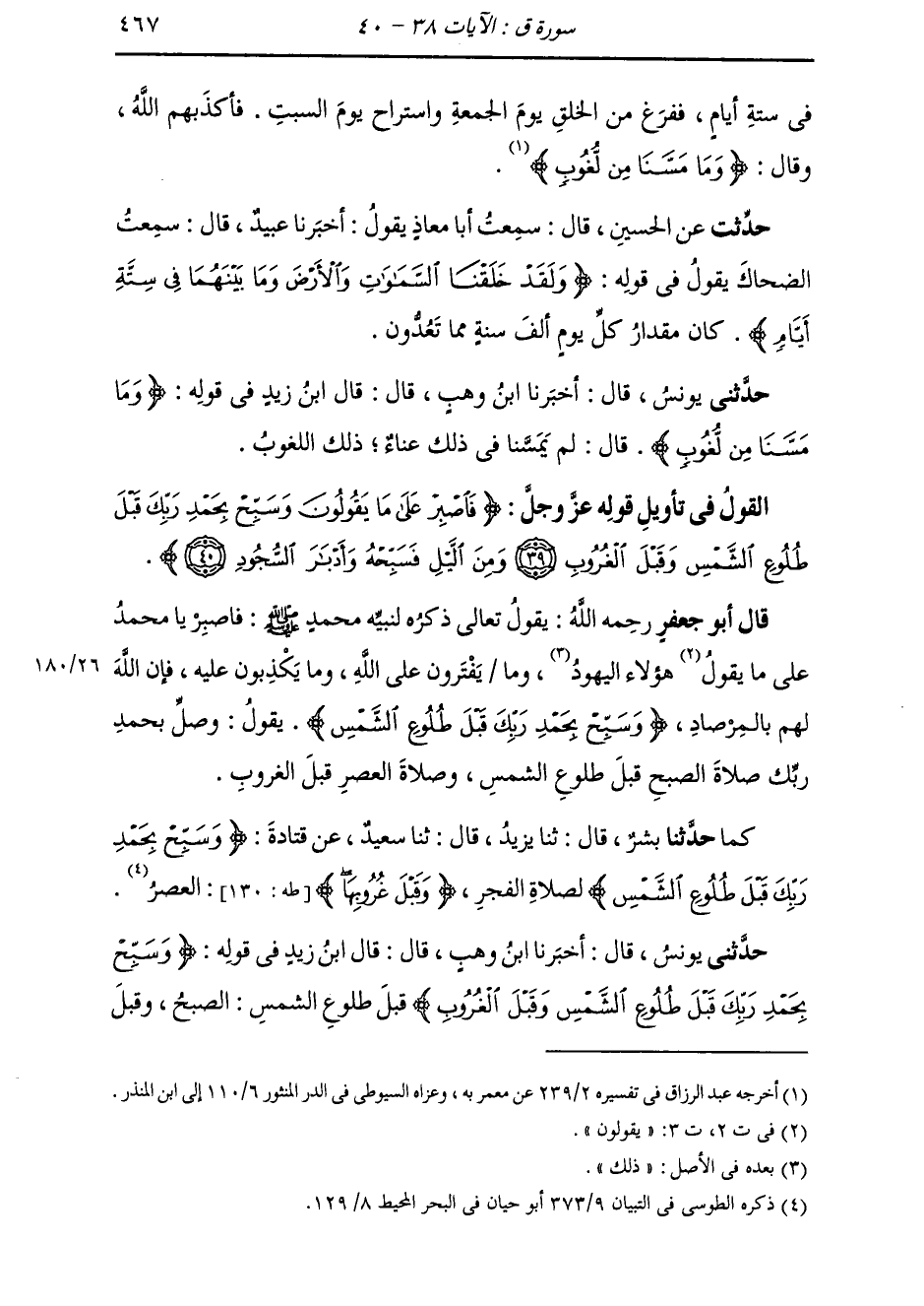 §الْقَوْلُ فِي تَأْوِيلِ قَوْلِهِ تَعَالَى: {فَاصْبِرْ عَلَى مَا يَقُولُونَ وَسَبِّحْ بِحَمْدِ رَبِّكَ قَبْلَ طُلُوعِ الشَّمْسِ وَقَبْلَ الْغُرُوبِ وَمِنَ اللَّيْلِ فَسَبِّحْهُ وَأَدْبَارَ السُّجُودِ} [ق: 40] يَقُولُ تَعَالَى ذِكْرُهُ لِنَبِيِّهِ مُحَمَّدٍ صَلَّى اللهُ عَلَيْهِ وَسَلَّمَ: فَاصْبِرْ يَا مُحَمَّدُ عَلَى مَا يَقُولُ هَؤُلَاءِ الْيَهُودُ، وَمَا يَفْتَرُونَ عَلَى اللَّهِ، وَيَكْذِبُونَ عَلَيْهِ، فَإِنَّ اللَّهَ لَهُمْ بِالْمِرْصَادِ {وَسَبِّحْ بِحَمْدِ رَبِّكَ قَبْلَ طُلُوعِ الشَّمْسِ} [طه: 130] يَقُولُ: وَصَلِّ بِحَمْدِ رَبِّكَ صَلَاةَ الصُّبْحِ قَبْلَ طُلُوعِ الشَّمْسِ وَصَلَاةَ الْعَصْرِ قَبْلَ الْغُرُوبِ