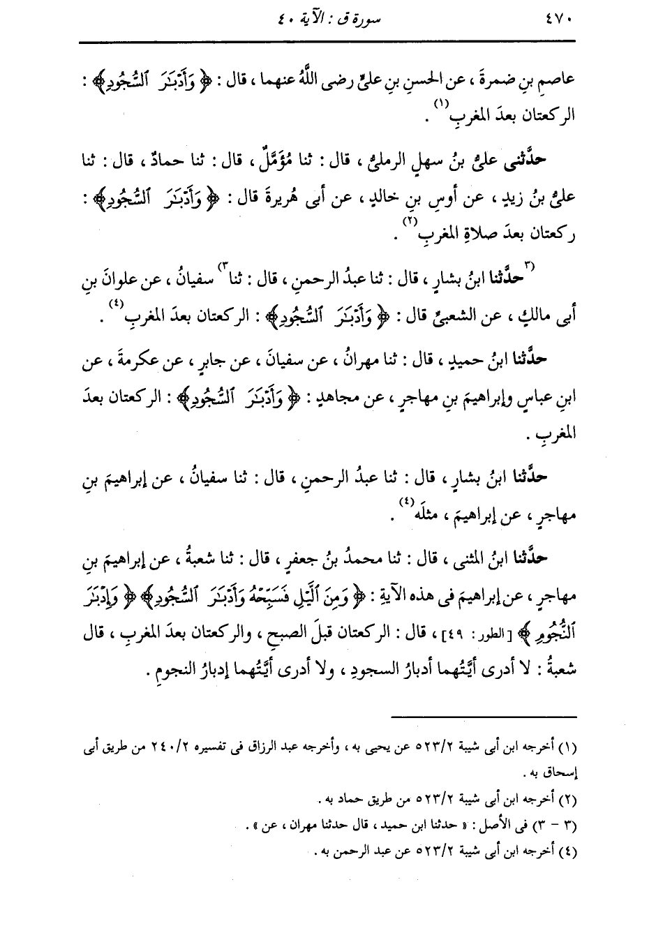 حَدَّثَنَا ابْنُ حُمَيْدٍ قَالَ: ثَنَا مِهْرَانُ، عَنْ سُفْيَانَ، عَنْ جَابِرٍ، عَنْ عِكْرِمَةَ، عَنِ ابْنِ عَبَّاسٍ، وَإِبْرَاهِيمَ بْنِ مُهَاجِرٍ، عَنْ مُجَاهِدٍ، {§أَدْبَارَ السُّجُودِ} [ق: 40] : «الرَّكْعَتَانِ بَعْدَ الْمَغْرِبِ» حَدَّثَنَا ابْنُ بَشَّارٍ قَالَ: ثَنَا عَبْدُ الرَّحْمَنِ قَالَ: ثَنَا سُفْيَانُ، عَنْ إِبْرَاهِيمَ بْنِ مُهَاجِرٍ، عَنْ إِبْرَاهِيمَ، مِثْلَهُ