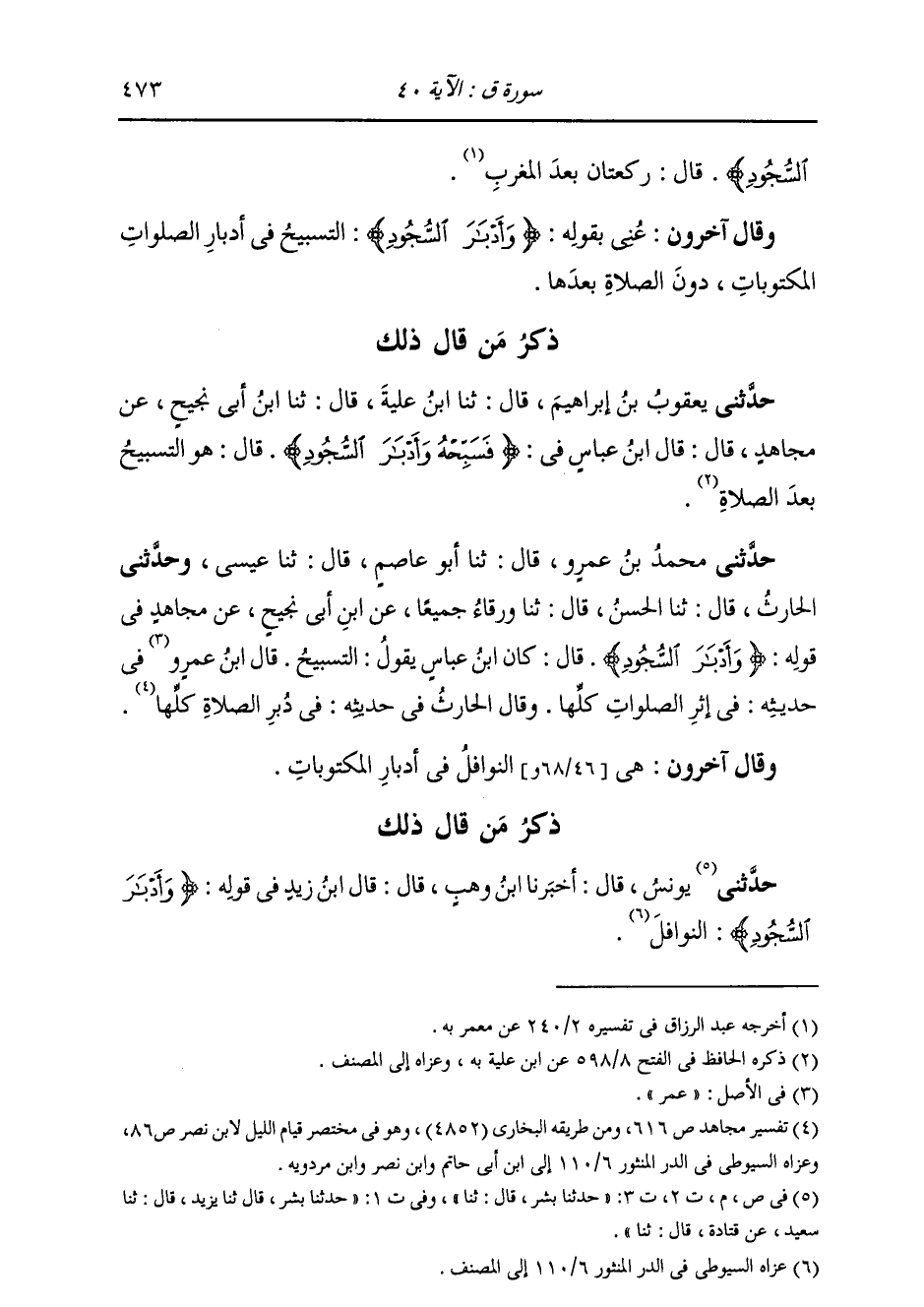 حَدَّثَنِي مُحَمَّدُ بْنُ عَمْرٍو قَالَ: ثَنَا أَبُو عَاصِمٍ قَالَ: ثَنَا عِيسَى، وَحَدَّثَنِي الْحَارِثُ قَالَ: ثَنَا الْحَسَنُ قَالَ: ثَنَا وَرْقَاءُ، جَمِيعًا، عَنِ ابْنِ أَبِي نَجِيحٍ، عَنْ مُجَاهِدٍ، فِي قَوْلِهِ: {§وَأَدْبَارَ السُّجُودِ} [ق: 40] قَالَ: كَانَ ابْنُ عَبَّاسٍ يَقُولُ: «التَّسْبِيحُ» قَالَ ابْنُ عَمْرٍو فِي حَدِيثِهِ: فِي إِثْرِ الصَّلَوَاتِ كُلِّهَا وَقَالَ الْحَارِثُ فِي حَدِيثِهِ: فِي دُبُرِ الصَّلَاةِ كُلِّهَا وَقَالَ آخَرُونَ: هِيَ النَّوَافِلُ فِي أَدْبَارِ الْمَكْتُوبَاتِ