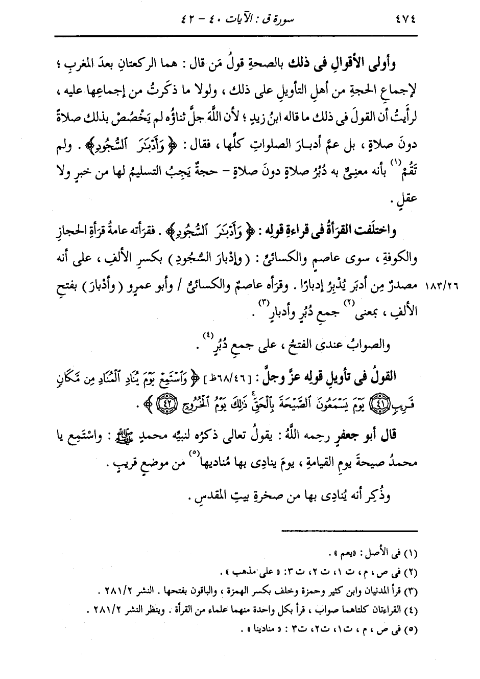 وَأَوْلَى الْأَقْوَالِ فِي ذَلِكَ بِالصِّحَّةِ قَوْلُ مَنْ قَالَ: هُمَا الرَّكْعَتَانِ بَعْدَ الْمَغْرِبِ، لِإِجْمَاعِ الْحُجَّةِ مِنْ أَهْلِ التَّأْوِيلِ عَلَى ذَلِكَ، وَلَوْلَا مَا ذَكَرْتُ مِنْ إِجْمَاعِهَا عَلَيْهِ، لَرَأَيْتُ أَنَّ الْقَوْلَ فِي ذَلِكَ مَا قَالَهُ ابْنُ زَيْدٍ، لِأَنَّ اللَّهَ جَلَّ ثَنَاؤُهُ لَمْ يُخَصِّصْ بِذَلِكَ صَلَاةً دُونَ صَلَاةٍ، بَلْ عَمَّ أَدْبَارَ الصَّلَوَاتِ كُلِّهَا، فَقَالَ: وَأَدْبَارَ السُّجُودِ، وَلَمْ تَقُمُّ بِأَنَّهُ مَعْنِيُّ بِهِ: دُبُرَ صَلَاةٍ دُونَ صَلَاةٍ، حُجَّةٌ يَجِبُ التَّسْلِيمُ لَهَا مِنْ خَبَرٍ وَلَا عَقْلٍ وَاخْتَلَفَتِ الْقُرَّاءُ فِي قِرَاءَةِ قَوْلِهِ: {وَأَدْبَارَ السُّجُودِ} [ق: 40] فَقَرَأَتْهُ عَامَّةُ قُرَّاءِ الْحِجَازِ وَالْكُوفَةِ، سِوَى عَاصِمٍ وَالْكِسَائِيِّ (وَإِدْبَارَ السُّجُودِ) بِكَسْرِ الْأَلِفِ، عَلَى أَنَّهُ مَصْدَرُ أَدْبَرَ يُدْبِرُ إِدْبَارًا وَقَرَأَهُ عَاصِمٌ وَالْكِسَائِيُّ وَأَبُو عَمْرٍو {وَأَدْبَارَ} [ق: 40] بِفَتْحِ الْأَلِفِ عَلَى مَذْهَبِ جَمْعِ دُبُرٍ وَأَدْبَارٍ وَالصَّوَابُ عِنْدِي الْفَتْحُ عَلَى جَمْعِ دُبُرٍ