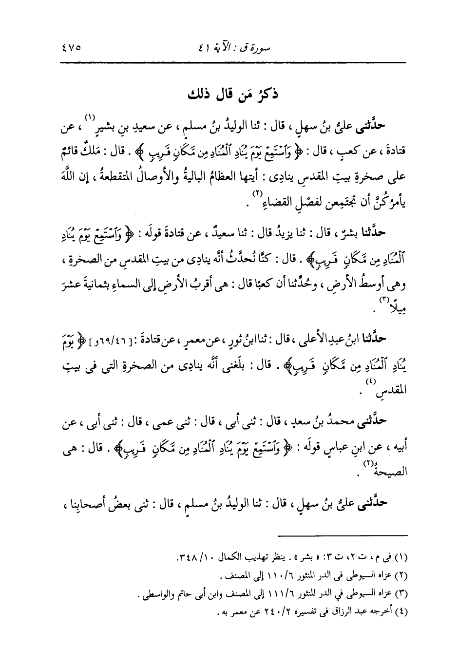 حَدَّثَنَا بِشْرٌ قَالَ: ثَنَا يَزِيدُ قَالَ: ثَنَا سَعِيدٌ، عَنْ قَتَادَةَ، {§وَاسْتَمِعْ يَوْمَ يُنَادِ الْمُنَادِ مِنْ مَكَانٍ قَرِيبٍ} [ق: 41] قَالَ: «كُنَّا نُحَدَّثُ أَنَّهُ يُنَادِي مِنْ بَيْتِ الْمَقْدِسِ مِنَ الصَّخْرَةِ، وَهِيَ أَوْسَطُ الْأَرْضِ» وَحُدِّثَنَا أَنَّ كَعْبًا قَالَ: هِيَ أَقْرَبُ الْأَرْضِ إِلَى السَّمَاءِ بِثَمَانِيَةَ عَشَرَ مِيلًا