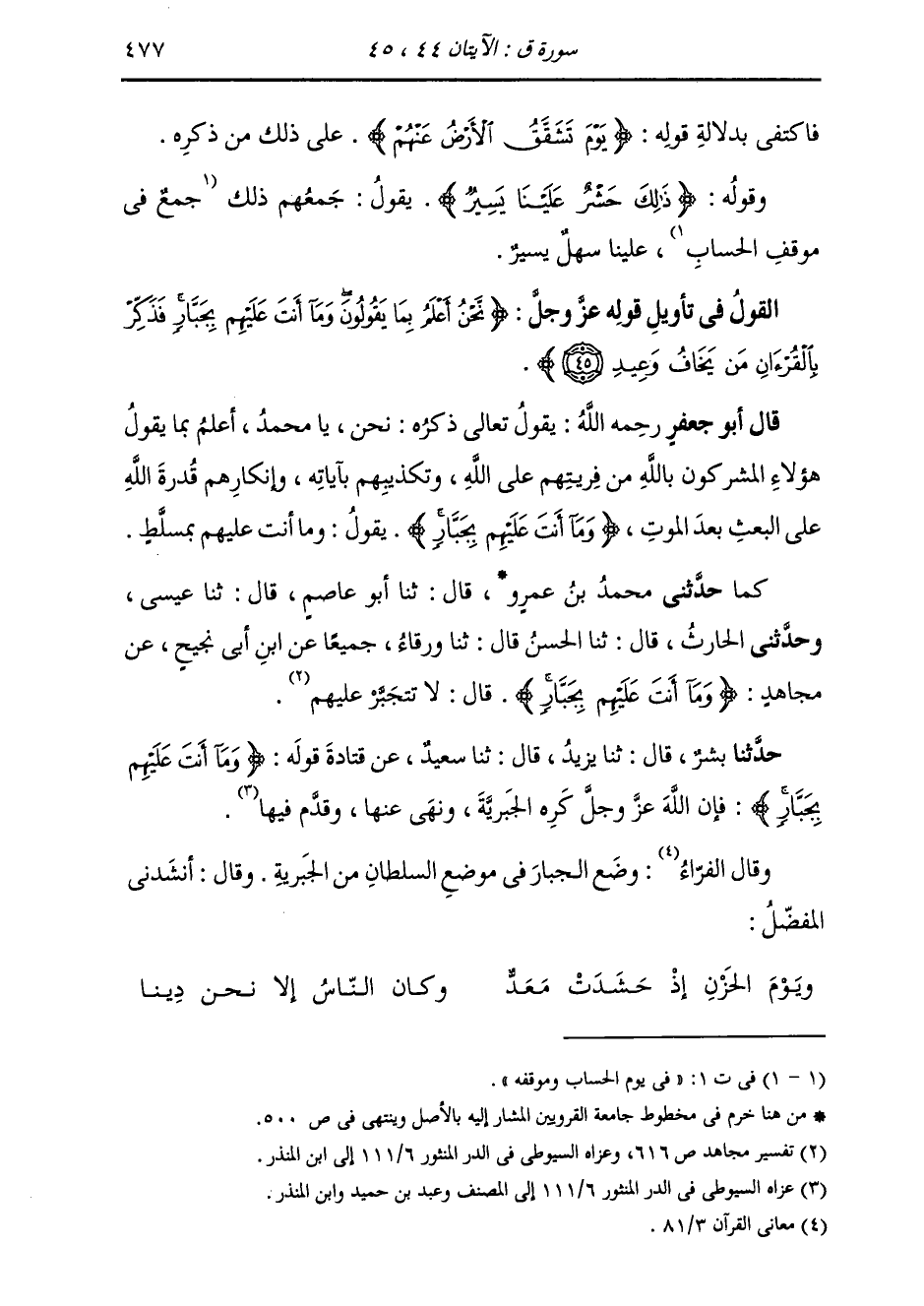 حَدَّثَنَا بِشْرٌ قَالَ: ثَنَا يَزِيدُ قَالَ: ثَنَا سَعِيدٌ، عَنْ قَتَادَةَ، قَوْلَهُ: {§وَمَا أَنْتَ عَلَيْهِمْ بِجَبَّارٍ} [ق: 45] «فَإِنَّ اللَّهَ عَزَّ وَجَلَّ كَرِهَ الْجَبْرِيَّةَ، وَنَهَى عَنْهَا، وَقَدَّمَ فِيهَا» وَقَالَ الْفَرَّاءُ: وُضِعَ الْجَبَّارُ فِي مَوْضِعِ السُّلْطَانِ مِنَ الْجَبْرِيَّةِ , وَقَالَ: أَنْشَدَنِي الْمُفَضَّلُ: