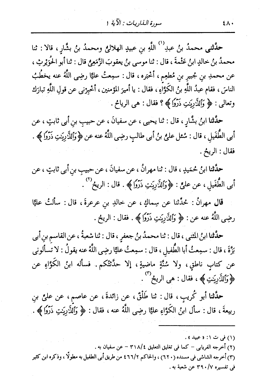 حَدَّثَنَا ابْنُ بَشَّارٍ قَالَ: ثَنَا يَحْيَى، عَنْ سُفْيَانَ، عَنْ حَبِيبِ بْنِ أَبِي ثَابِتٍ، عَنْ أَبِي الطُّفَيْلِ قَالَ: سُئِلَ عَلِيُّ بْنُ أَبِي طَالِبٍ رَضِيَ اللَّهُ عَنْهُ، عَنِ {§الذَّارِيَاتِ ذَرْوًا} [الذاريات: 1] فَقَالَ: «الرِّيحُ»