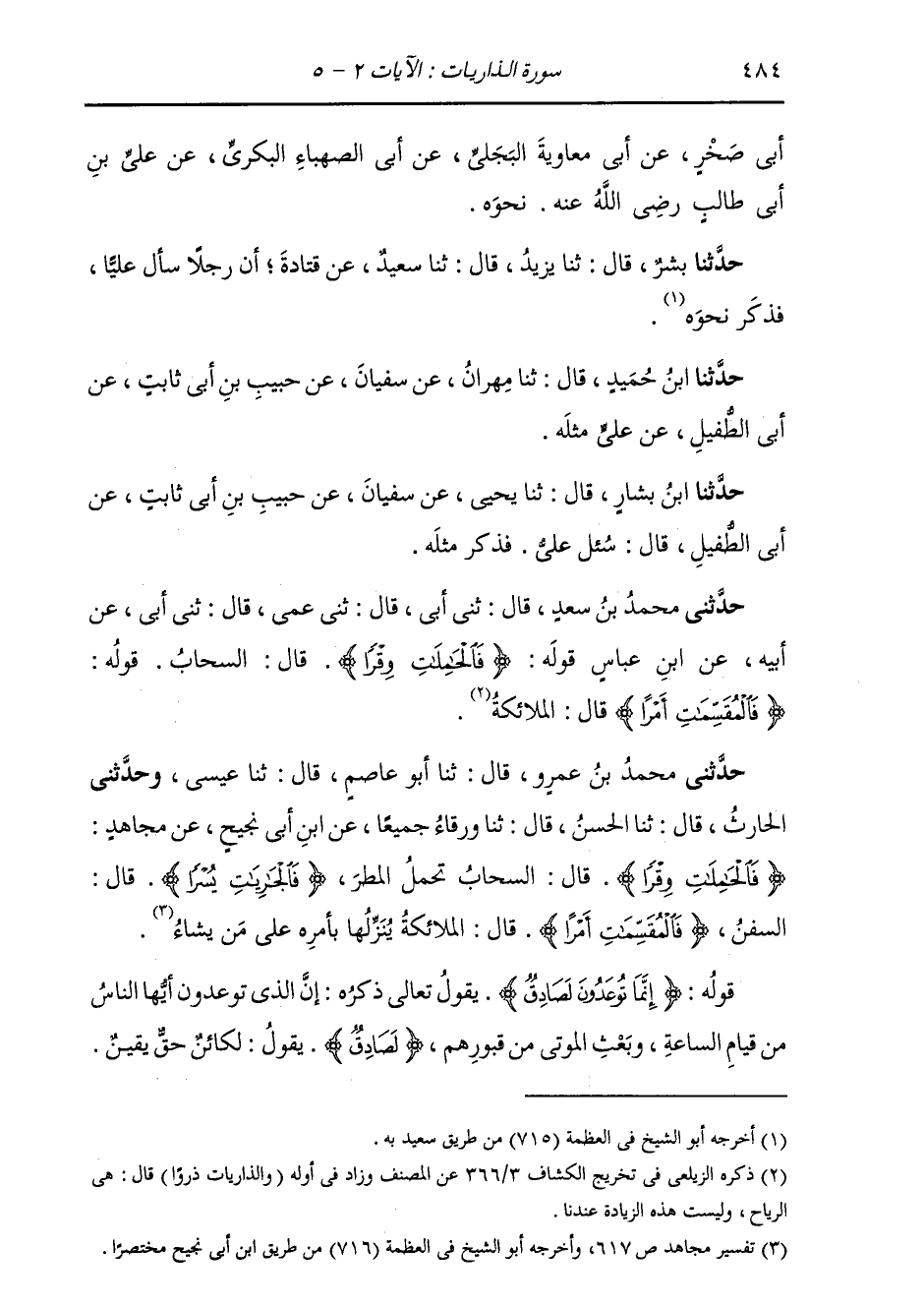 حَدَّثَنِي مُحَمَّدُ بْنُ سَعْدٍ قَالَ: ثَنِي أَبِي قَالَ: ثَنِي عَمِّي قَالَ: ثَنِي أَبِي، عَنْ أَبِيهِ، عَنِ ابْنِ عَبَّاسٍ، قَوْلَهُ: {§فَالْحَامِلَاتِ وِقْرًا} [الذاريات: 2] قَالَ: «السَّحَابُ» ، قَوْلَهُ: {فَالْمُقَسِّمَاتِ أَمْرًا} [الذاريات: 4] قَالَ: «الْمَلَائِكَةُ»