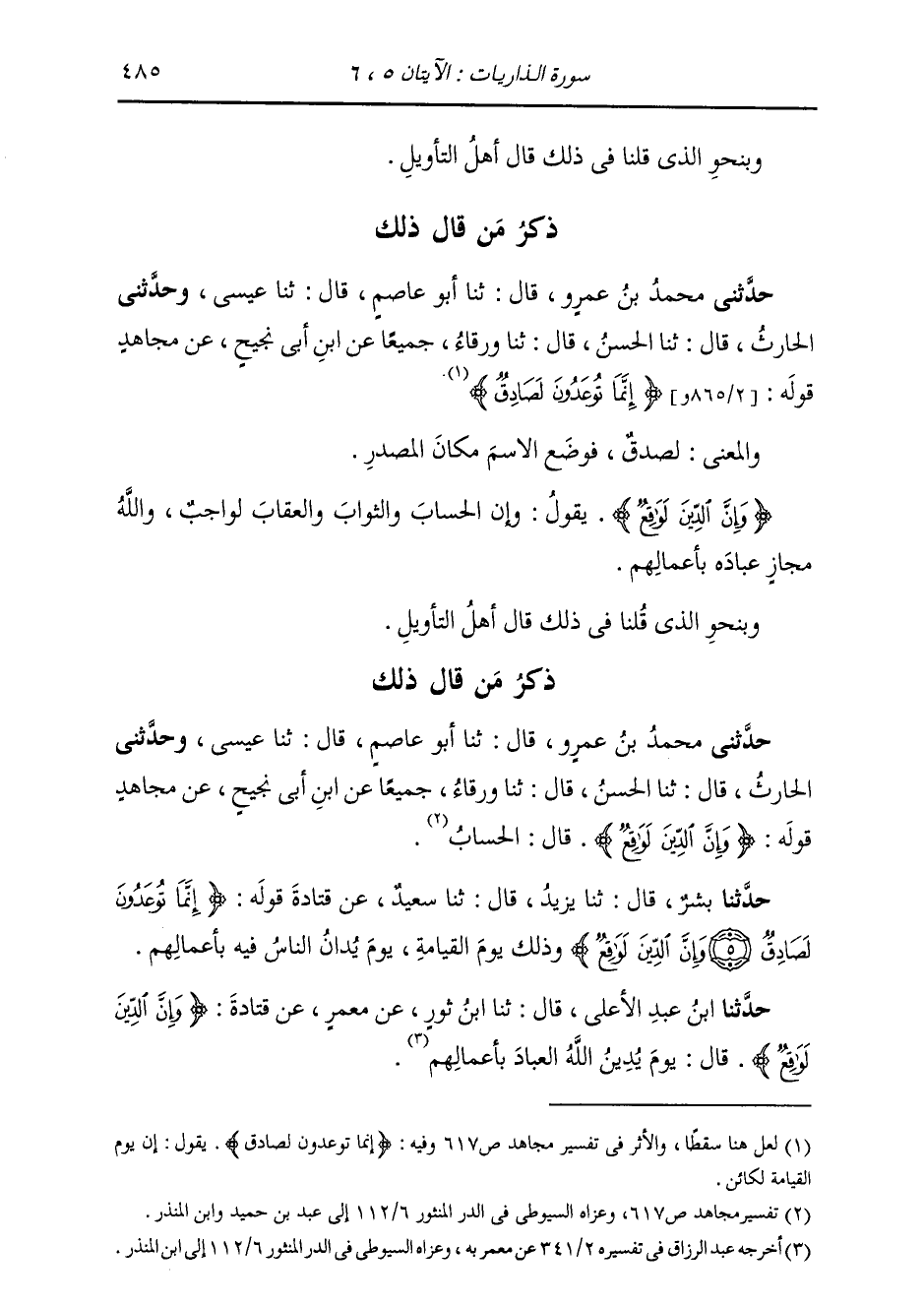 ذِكْرُ مَنْ قَالَ ذَلِكَ: حَدَّثَنِي مُحَمَّدُ بْنُ عَمْرٍو قَالَ: ثَنَا أَبُو عَاصِمٍ قَالَ: ثَنَا عِيسَى؛ وَحَدَّثَنِي الْحَارِثُ قَالَ: ثَنَا الْحَسَنُ قَالَ: ثَنَا وَرْقَاءُ جَمِيعًا، عَنِ ابْنِ أَبِي نَجِيحٍ، عَنْ مُجَاهِدٍ، قَوْلَهُ: {§وَإِنَّ الدِّينَ لَوَاقِعٌ} [الذاريات: 6] قَالَ: «الْحِسَابُ»