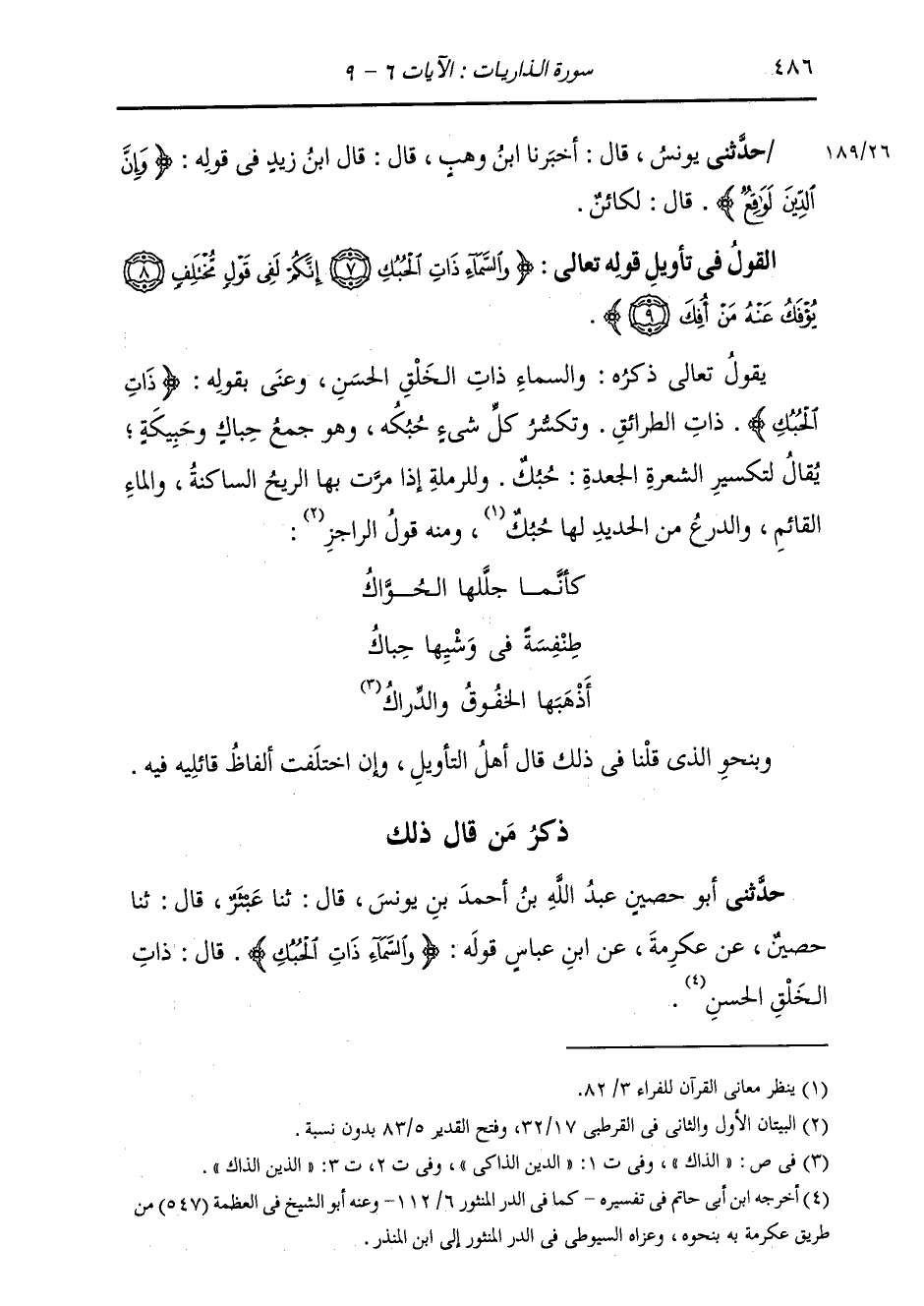 §الْقَوْلُ فِي تَأْوِيلِ قَوْلِهِ تَعَالَى: {وَالسَّمَاءِ ذَاتِ الْحُبُكِ إِنَّكُمْ لَفِي قَوْلٍ مُّخْتَلِفٍ يُؤْفَكُ عَنْهُ مَنْ أُفِكَ} [الذاريات: 8] يَقُولُ تَعَالَى ذِكْرُهُ: وَالسَّمَاءِ ذَاتِ الْخَلْقِ الْحَسَنِ وَعَنَى بِقَوْلِهِ: {ذَاتِ الْحُبُكِ} [الذاريات: 7] : ذَاتِ الطِّرَائِقِ، وَتَكْسِيرُ كُلِّ شَيْءٍ: حَبْكُهُ، وَهُوَ جَمْعُ حِبَاكٍ وَحَبِيكَةٍ؛ يُقَالُ لِتَكْسِيرِ الشَّعَرَةِ الْجَعْدَةِ: حُبُكٌ؛ وَلِلرَّمْلَةِ إِذَا مَرَّتْ بِهَا الرِّيحُ السَّاكِنَةُ، وَالْمَاءُ الْقَائِمُ، وَالدِّرْعُ مِنَ الْحَدِيدِ لَهَا: حُبُكٌ؛ وَمِنْهُ قَوْلُ الرَّاجِزِ: