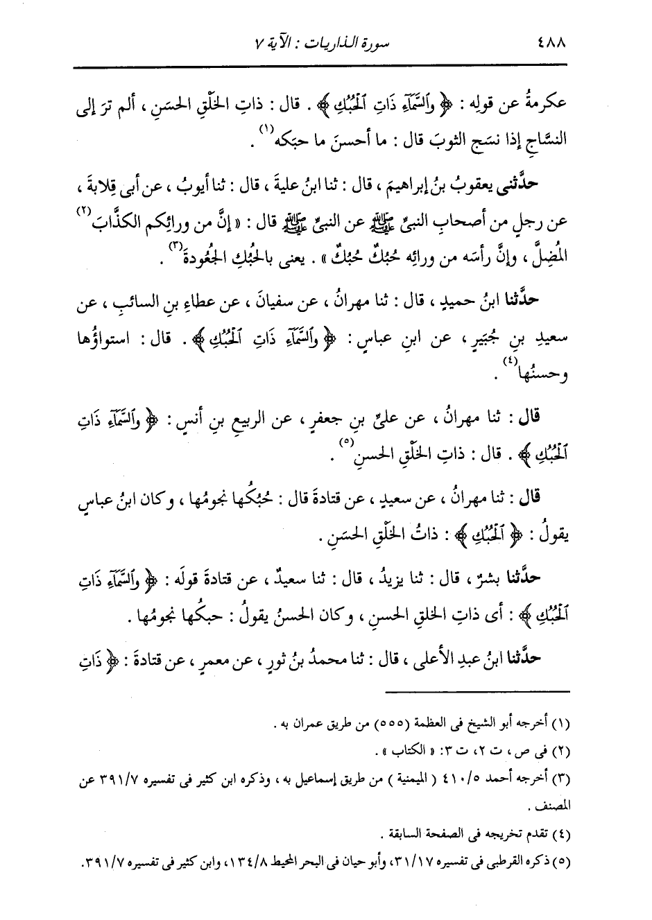 حَدَّثَنَا ابْنُ حُمَيْدٍ قَالَ: ثَنَا مِهْرَانُ، عَنْ سُفْيَانَ، عَنْ عَطَاءِ بْنِ السَّائِبِ، عَنْ سَعِيدِ بْنِ جُبَيْرٍ، عَنِ ابْنِ عَبَّاسٍ {§وَالسَّمَاءِ ذَاتِ الْحُبُكِ} [الذاريات: 7] قَالَ: «اسْتِوَاؤُهَا، حُسْنُهَا»