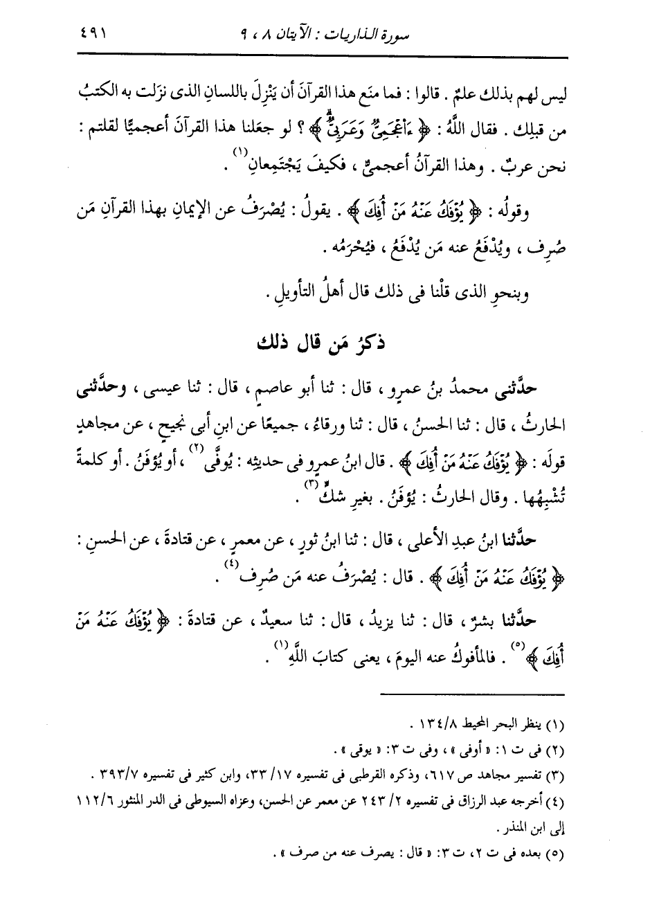 ذِكْرُ مَنْ قَالَ ذَلِكَ: حَدَّثَنِي مُحَمَّدُ بْنُ عَمْرٍو قَالَ: ثَنَا أَبُو عَاصِمٍ قَالَ: ثَنَا عِيسَى، وَحَدَّثَنِي الْحَارِثُ قَالَ: ثَنَا الْحَسَنُ قَالَ: ثَنَا وَرْقَاءُ، جَمِيعًا، عَنِ ابْنِ أَبِي نَجِيحٍ، عَنْ مُجَاهِدٍ، قَوْلَهُ: {§يُؤْفَكُ عَنْهُ مَنْ أُفِكَ} [الذاريات: 9] قَالَ ابْنُ عَمْرٍو فِي حَدِيثِهِ: «يُوفَى، أَوْ يُؤْفَنُ» ، أَوْ كَلِمَةً تُشْبِهُهَا وَقَالَ الْحَارِثُ: يُؤْفَنُ، بِغَيْرِ شَكٍّ