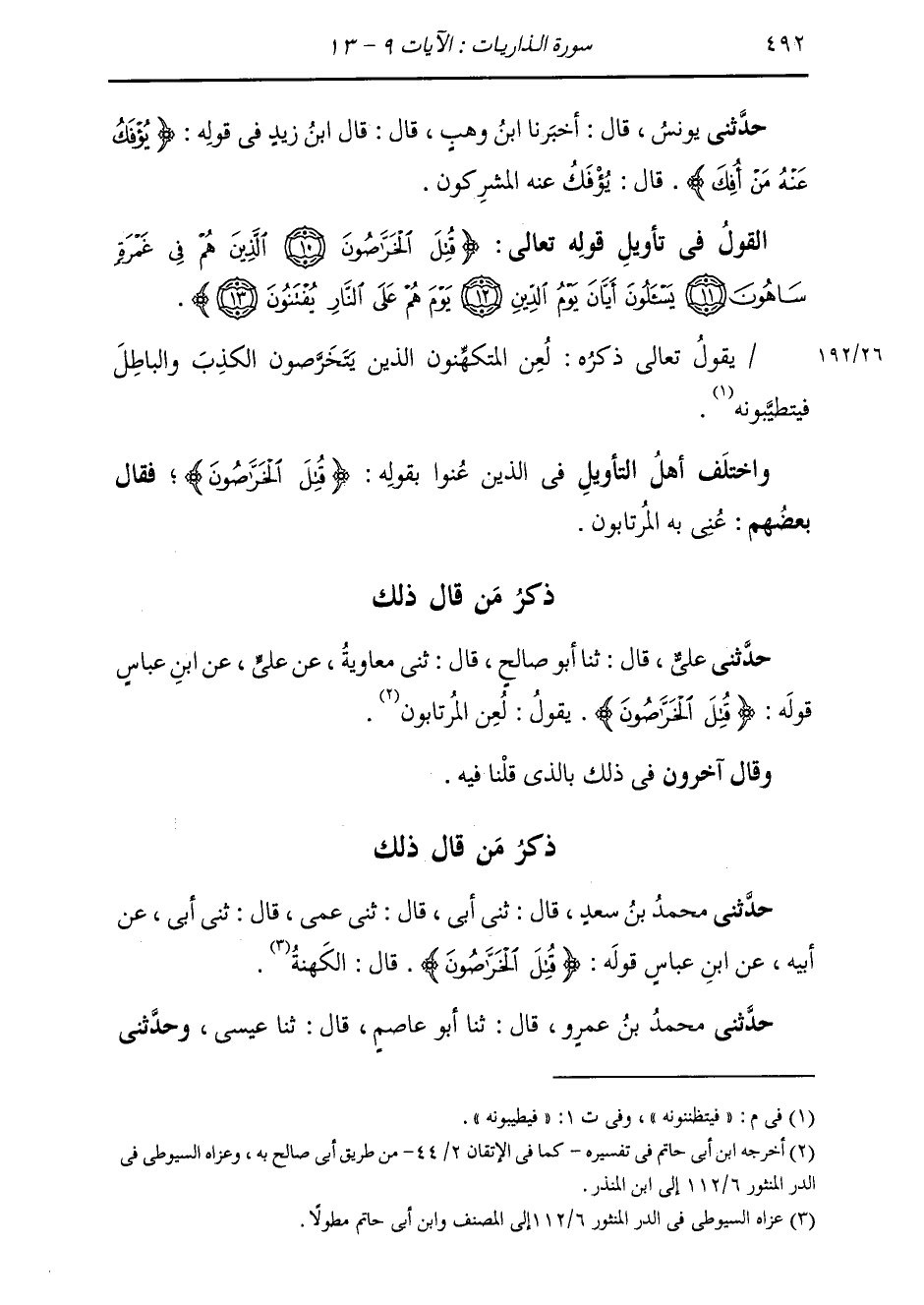 §الْقَوْلُ فِي تَأْوِيلِ قَوْلِهِ تَعَالَى: {قُتِلَ الْخَرَّاصُونَ الَّذِينَ هُمْ فِي غَمْرَةٍ سَاهُونَ يَسْأَلُونَ أَيَّانَ يَوْمُ الدِّينِ يَوْمَ هُمْ عَلَى النَّارِ يُفْتَنُونَ} [الذاريات: 11] يَقُولُ تَعَالَى ذِكْرُهُ: لُعِنَ الْمُتَكَهِّنُونَ الَّذِينَ يَتَخَرَّصُونَ الْكَذِبَ وَالْبَاطِلَ فَيَتَظَنَّنُونَهُ وَاخْتَلَفَ أَهْلُ التَّأْوِيلِ فِي الَّذِينَ عُنُوا بِقَوْلِهِ {قُتِلَ الْخَرَّاصُونَ} [الذاريات: 10] فَقَالَ بَعْضُهُمْ: عُنِيَ بِهِ الْمُرْتَابُونَ