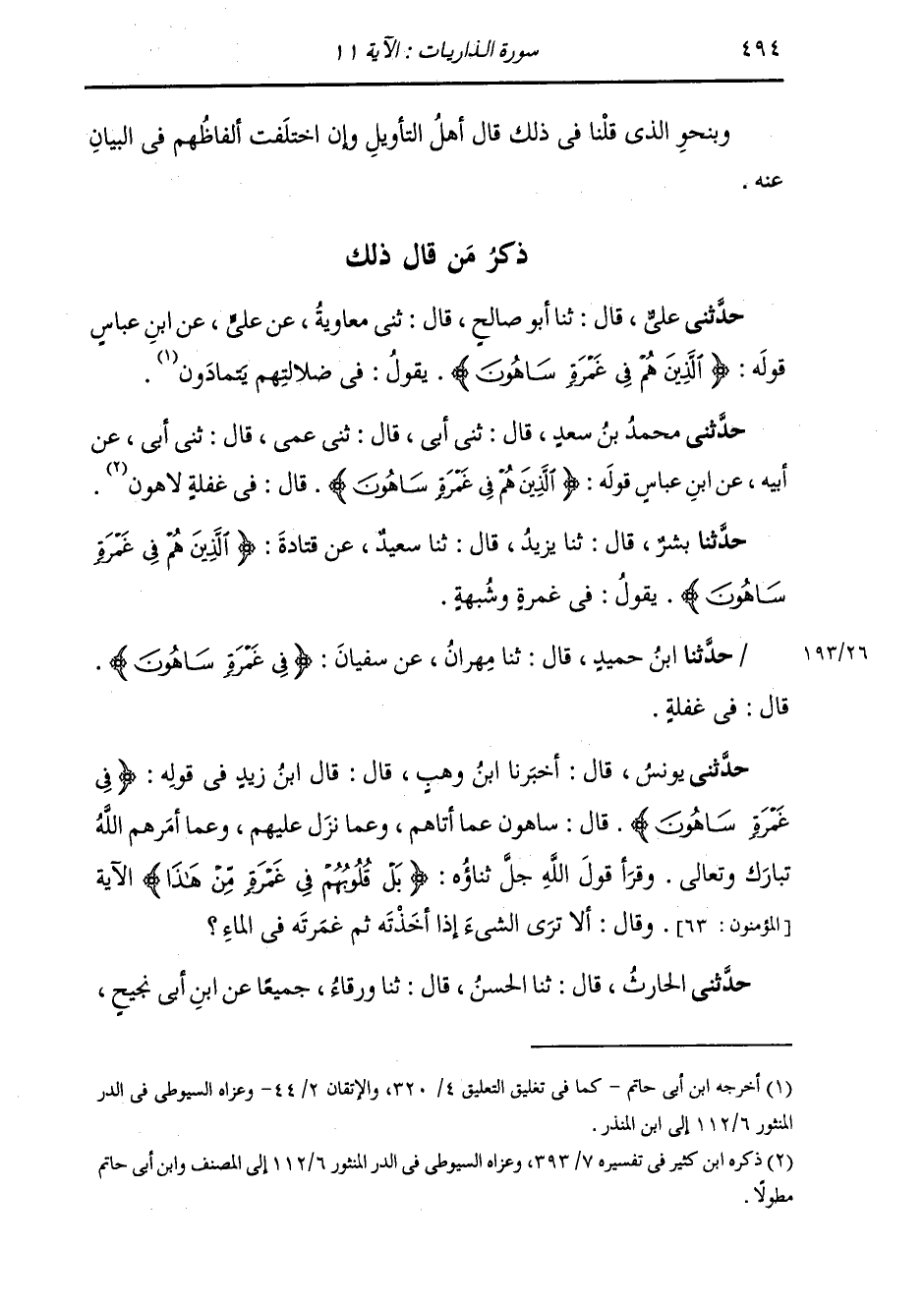 ذِكْرُ مَنْ قَالَ ذَلِكَ: حَدَّثَنِي عَلِيٌّ قَالَ: ثَنَا أَبُو صَالِحٍ قَالَ: ثَنِي مُعَاوِيَةُ، عَنْ عَلِيٍّ، عَنِ ابْنِ عَبَّاسٍ، قَوْلَهُ: {§الَّذِينَ هُمْ فِي غَمْرَةٍ سَاهُونَ} [الذاريات: 11] يَقُولُ: «فِي ضَلَالَتِهِمْ يَتَمَادَوْنَ»