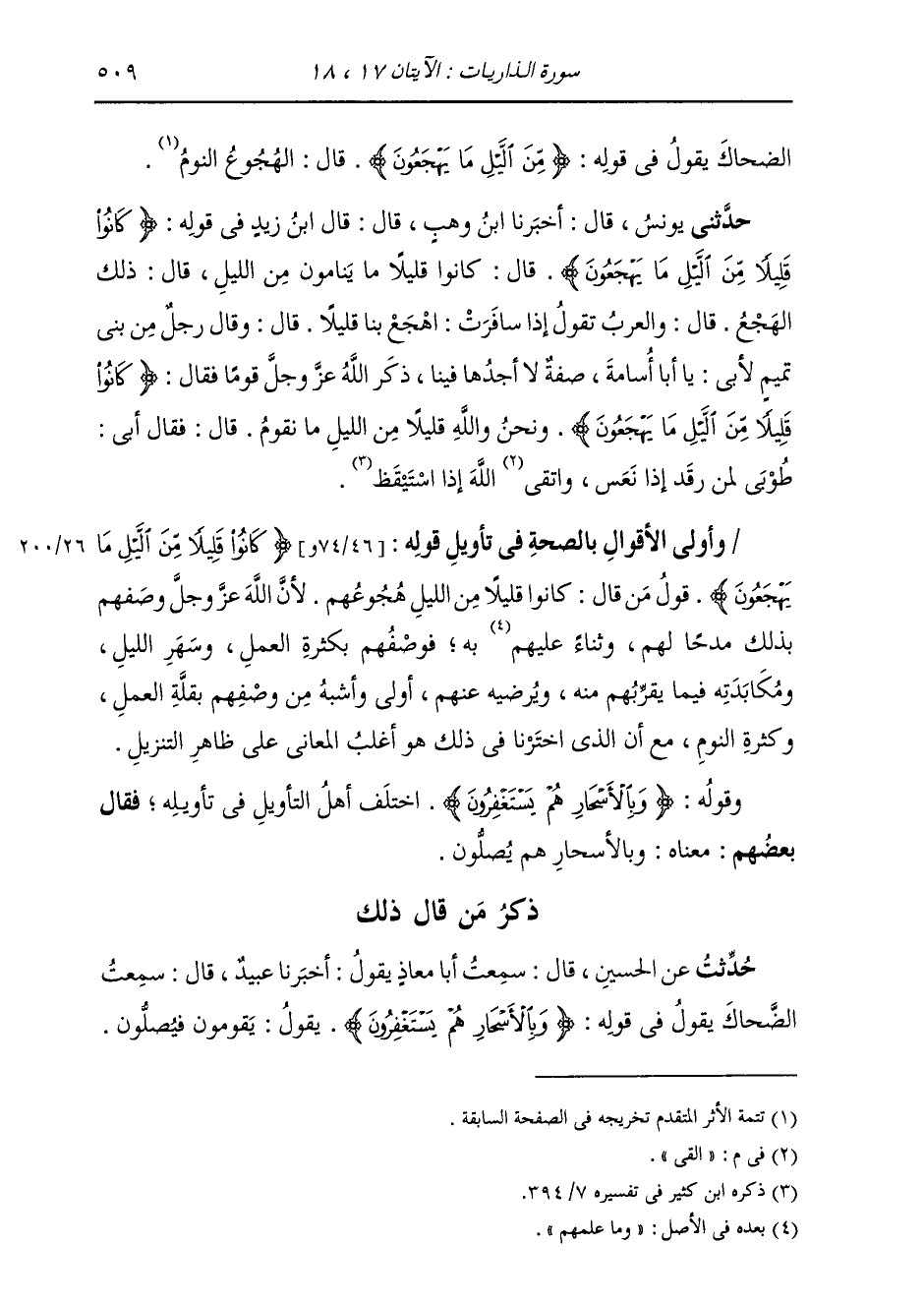 حَدَّثَنِي يُونُسُ قَالَ: أَخْبَرَنَا ابْنُ وَهْبٍ قَالَ: قَالَ ابْنُ زَيْدٍ، فِي قَوْلِهِ: {§كَانُوا قَلِيلًا مِنَ اللَّيْلِ مَا يَهْجَعُونَ} [الذاريات: 17] قَالَ: " كَانُوا قَلِيلًا مَا يَنَامُونَ مِنَ اللَّيْلِ قَالَ: ذَاكَ الْهَجْعُ قَالَ: وَالْعَرَبُ تَقُولُ: إِذَا سَافَرَتِ اهْجَعْ بِنَا قَلِيلًا قَالَ: وَقَالَ رَجُلٌ مِنْ بَنِي تَمِيمٍ لِأَبِي: يَا أَبَا أُسَامَةَ صِفَةٌ لَا أَجِدُهَا فِينَا، ذَكَرَ اللَّهُ تَبَارَكَ وَتَعَالَى قَوْمًا فَقَالَ: {كَانُوا قَلِيلًا مِنَ اللَّيْلِ مَا يَهْجَعُونَ} [الذاريات: 17] " وَنَحْنُ وَاللَّهِ قَلِيلًا مِنَ اللَّيْلِ مَا نَقُومُ؛ قَالَ: فَقَالَ أَبِي: طُوبَى لِمَنْ رَقَدَ إِذَا نَعَسَ؛ وَأَلْقَى اللَّهَ إِذَا اسْتَيْقَظَ " وَأَوْلَى الْأَقْوَالِ بِالصِّحَّةِ فِي تَأْوِيلِ قَوْلِهِ: {كَانُوا قَلِيلًا مِنَ اللَّيْلِ مَا يَهْجَعُونَ} [الذاريات: 17] قَوْلُ مَنْ قَالَ: كَانُوا قَلِيلًا مِنَ اللَّيْلِ هُجُوعُهُمْ، لِأَنَّ اللَّهَ تَبَارَكَ وَتَعَالَى وَصَفَهُمْ بِذَلِكَ مَدْحًا لَهُمْ، وَأَثْنَى عَلَيْهِمْ بِهِ، فَوَصَفَهُمْ بِكَثْرَةِ الْعَمَلِ، وَسَهَرِ اللَّيْلِ، وَمُكَابَدَتِهِ فِيمَا يُقَرِّبُهُمْ مِنْهُ وَيُرْضِيهِ عَنْهُمْ أَوْلَى وَأَشْبَهُ مِنْ وَصْفِهِمْ مِنْ قِلَّةِ الْعَمَلِ، وَكَثْرَةِ النَّوْمِ، مَعَ أَنَّ الَّذِيَ اخْتَرْنَا فِي ذَلِكَ هُوَ أَغْلَبُ الْمَعَانِي عَلَى ظَاهِرِ التَّنْزِيلِ