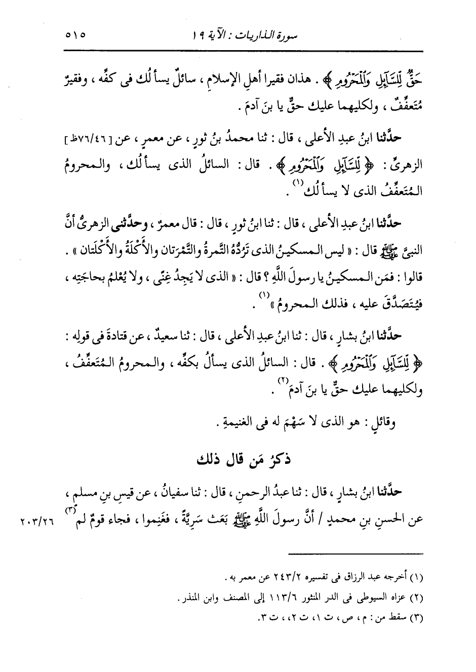 حَدَّثَنَا ابْنُ عَبْدِ الْأَعْلَى قَالَ: ثَنَا مُحَمَّدُ بْنُ ثَوْرٍ، عَنْ مَعْمَرٍ، عَنِ الزُّهْرِيِّ، {§لِلسَّائِلِ وَالْمَحْرُومِ} [الذاريات: 19] قَالَ: " السَّائِلُ: الَّذِي يَسْأَلُ، وَالْمَحْرُومُ: الْمُتَعَفِّفُ الَّذِي لَا يَسْأَلُ "