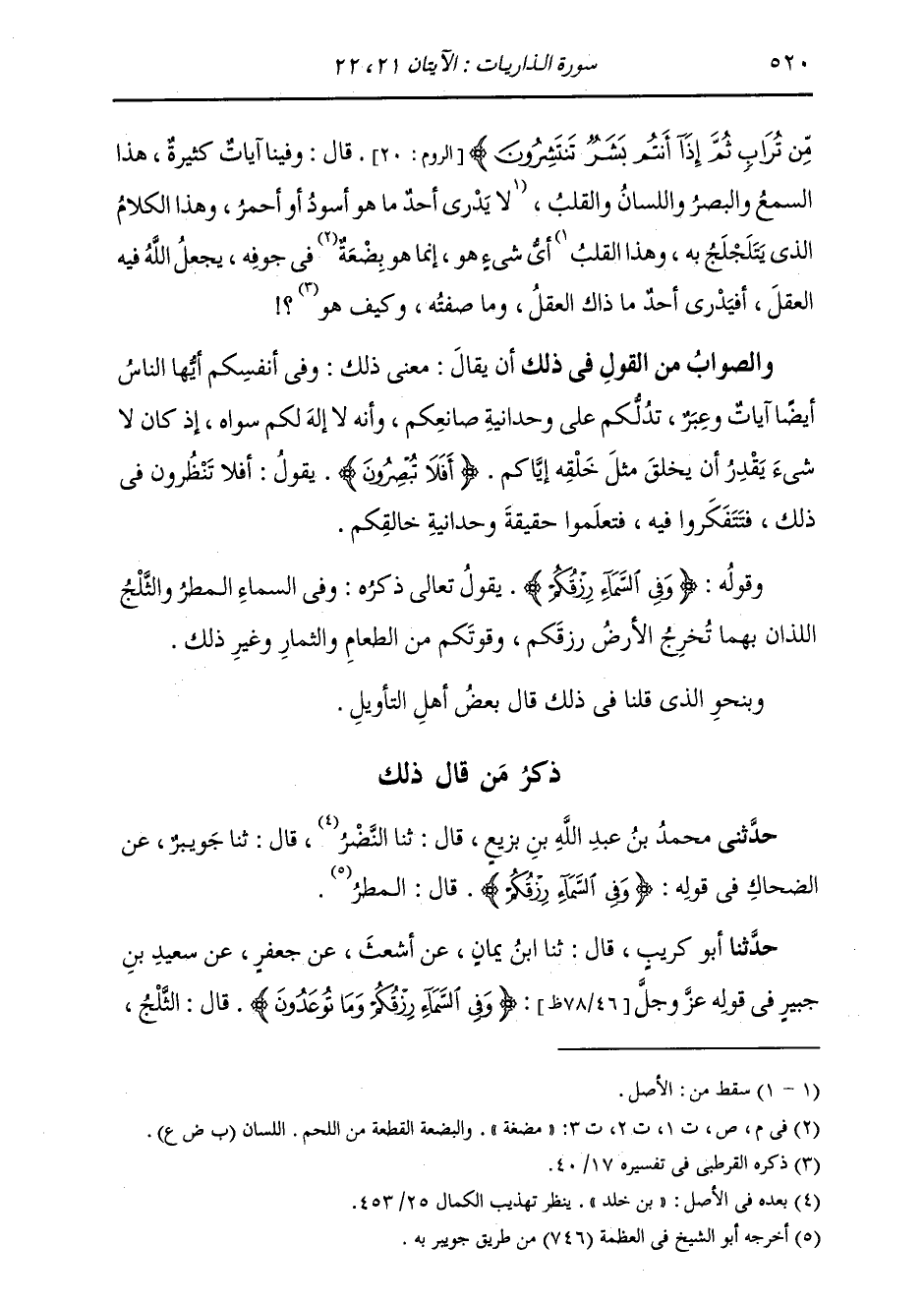 مِنْ تُرَابٍ ثُمَّ إِذَا أَنْتُمْ بِشْرٌ تَنْتَشِرُونَ} [الروم: 20] قَالَ: «وَفِينَا آيَاتٌ كَثِيرَةٌ، هَذَا السَّمْعُ وَالْبَصَرُ وَاللِّسَانُ وَالْقَلْبُ، لَا يَدْرِي أَحَدٌ مَا هُوَ أَسْوَدُ أَوْ أَحْمَرُ، وَهَذَا الْكَلَامُ الَّذِي يَتَلَجْلَجُ بِهِ، وَهَذَا الْقَلْبُ أَيُّ شَيْءٍ هُوَ، إِنَّمَا هُوَ مُضْغَةٌ فِي جَوْفِهِ، يَجْعَلُ اللَّهُ فِيهِ الْعَقْلَ، أَفَيَدْرِي أَحَدٌ مَا ذَاكَ الْعَقْلُ، وَمَا صِفَتُهُ، وَكَيْفَ هُوَ؟» وَالصَّوَابُ مِنَ الْقَوْلِ فِي ذَلِكَ أَنْ يُقَالَ: مَعْنَى ذَلِكَ: وَفِي أَنْفُسِكُمْ أَيْضًا أَيُّهَا النَّاسُ آيَاتٌ وَعِبَرٌ تَدُلُّكُمْ عَلَى وَحْدَانِيَّةِ صَانِعِكُمْ، وَأَنَّهُ لَا إِلَهَ لَكُمْ سِوَاهُ، إِذْ كَانَ لَا شَيْءَ يَقْدِرُ عَلَى أَنْ يَخْلُقَ مِثْلَ خَلْقِهِ إِيَّاكُمْ {أَفَلَا تُبْصِرُونَ} [الذاريات: 21] يَقُولُ: أَفَلَا تَنْظُرُونَ فِي ذَلِكَ فَتَتَفَكَّرُوا فِيهِ، فَتَعْلَمُوا حَقِيقَةَ وَحْدَانِيَّةِ خَالِقِكُمْ