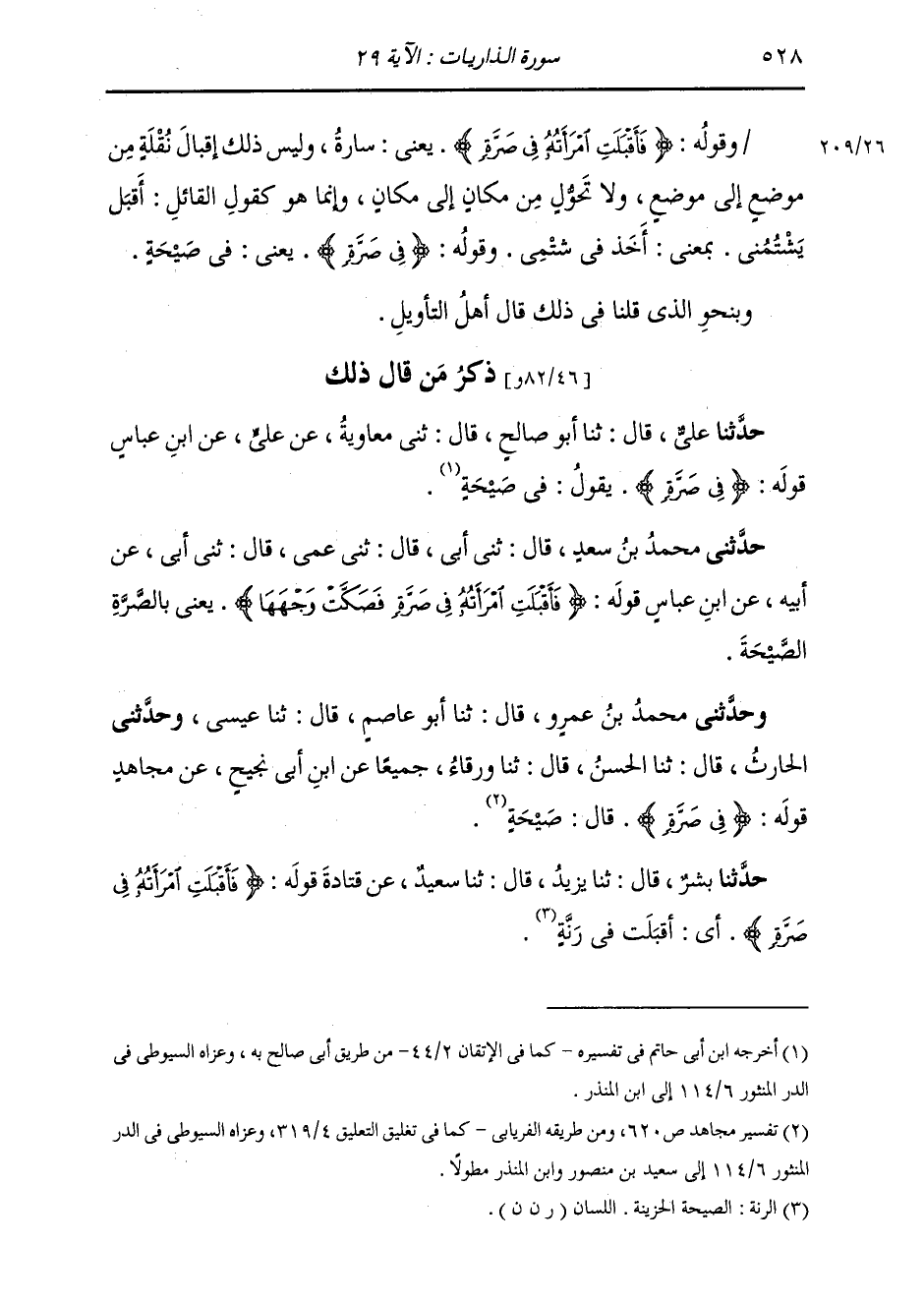 ذِكْرُ مَنْ قَالَ ذَلِكَ: حَدَّثَنِي عَلِيٌّ قَالَ: ثَنَا أَبُو صَالِحٍ قَالَ: ثَنِي مُعَاوِيَةُ، عَنْ عَلِيٍّ، عَنِ ابْنِ عَبَّاسٍ، قَوْلَهُ: {§فِي صَرَّةٍ} [الذاريات: 29] يَقُولُ: «فِي صَيْحَةٍ»