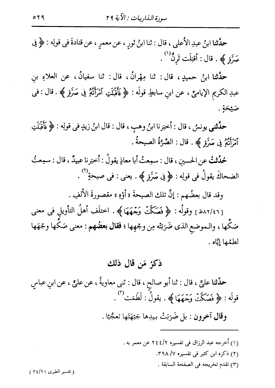 ذِكْرُ مَنْ قَالَ ذَلِكَ: حَدَّثَنِي عَلِيٌّ قَالَ: ثَنَا أَبُو صَالِحٍ قَالَ: ثَنِي مُعَاوِيَةُ، عَنْ عَلِيٍّ، عَنِ ابْنِ عَبَّاسٍ، قَوْلَهُ: {§فَصَكَّتْ وَجْهَهَا} [الذاريات: 29] يَقُولُ: «لَطَمَتْ» وَقَالَ آخَرُونَ: بَلْ ضَرَبَتْ بِيَدِهَا جَبْهَتَهَا تَعَجُّبًا