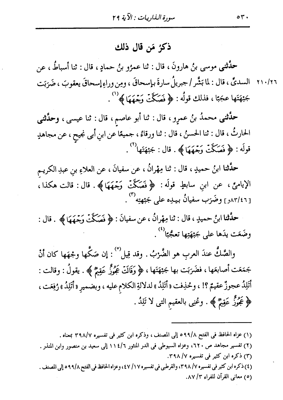 حَدَّثَنِي ابْنُ حُمَيْدٍ قَالَ: ثَنَا مِهْرَانُ، عَنْ سُفْيَانَ، عَنِ الْعَلَاءِ بْنِ عَبْدِ الْكَرِيمِ الْيَامِيِّ، عَنِ ابْنِ سَابِطٍ، قَوْلَهُ: {§فَصَكَّتْ وَجْهَهَا} [الذاريات: 29] قَالَ: «قَالَتْ هَكَذَا» . وَضَرَبَ سُفْيَانُ بِيَدِهِ عَلَى جَبْهَتِهِ