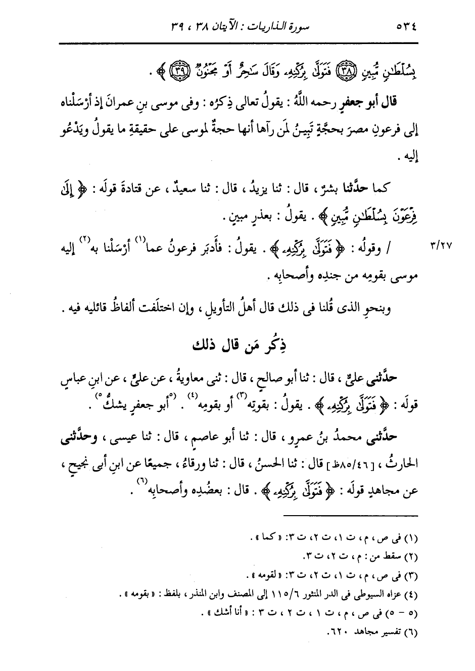 ذِكْرُ مَنْ قَالَ ذَلِكَ: حَدَّثَنِي عَلِيٌّ قَالَ: ثَنَا أَبُو صَالِحٍ قَالَ: ثَنِي مُعَاوِيَةُ، عَنْ عَلِيٍّ، عَنِ ابْنِ عَبَّاسٍ، قَوْلَهُ: {§فَتَوَلَّى بِرُكْنِهِ} [الذاريات: 39] يَقُولُ «لِقَوْمِهِ، أَوْ بِقَوْمِهِ، أَنَا أَشُكُّ»