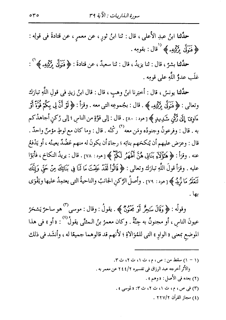 حَدَّثَنَا ابْنُ عَبْدِ الْأَعْلَى قَالَ: ثَنَا ابْنُ ثَوْرٍ، عَنْ مَعْمَرٍ، عَنْ قَتَادَةَ، فِي قَوْلِهِ: {§فَتَوَلَّى بِرُكْنِهِ} [الذاريات: 39] «غَلَبَ عَدُوُّ اللَّهِ عَلَى قَوْمِهِ»