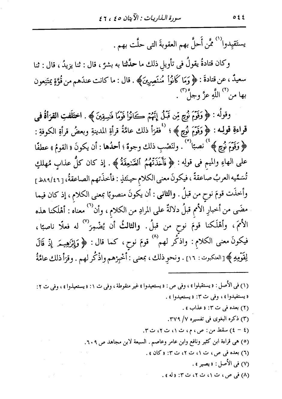 §وَقَوْلُهُ: {وَقَوْمَ نُوحٍ مِنْ قَبْلُ إِنَّهُمْ كَانُوا قَوْمًا فَاسِقِينَ} [الذاريات: 46] اخْتَلَفَتِ الْقُرَّاءُ فِي قِرَاءَةِ قَوْلِهِ: {وَقَوْمَ نُوحٍ} [الفرقان: 37] نَصْبًا وَلِنَصْبِ ذَلِكَ وُجُوهٌ: أَحَدُهَا: أَنْ يَكُونَ الْقَوْمُ عَطْفًا عَلَى الْهَاءِ وَالْمِيمِ فِي قَوْلِهِ: {فَأَخَذَتْهُمُ الصَّاعِقَةُ} [النساء: 153] إِذْ كَانَ كُلُّ عَذَابٍ مُهْلِكٍ تُسَمِّيهِ الْعَرَبُ صَاعِقَةً، فَيَكُونُ مَعْنَى الْكَلَامِ حِينَئِذٍ: فَأَخَذَتْهُمُ الصَّاعِقَةُ وَأَخَذَتْ قَوْمَ نُوحٍ مِنْ قَبْلُ وَالثَّانِي: أَنْ يَكُونَ مَنْصُوبًا بِمَعْنَى الْكَلَامِ، إِذْ كَانَ فِيمَا مَضَى مِنْ أَخْبَارِ الْأُمَمِ قَبْلُ دِلَالَةٌ عَلَى الْمُرَادِ مِنَ الْكَلَامِ، وَأَنَّ مَعْنَاهُ: أَهْلَكْنَا هَذِهِ الْأُمَمَ، وَأَهْلَكْنَا قَوْمَ نُوحٍ مِنْ قَبْلُ. وَالثَّالِثُ: أَنْ يُضْمَرَ لَهُ فِعْلًا نَاصِبًا، فَيَكُونُ مَعْنَى الْكَلَامِ: وَاذْكُرْ لَهُمْ قَوْمَ نُوحٍ، كَمَا قَالَ: {وَإِبْرَاهِيمَ إِذْ قَالَ لِقَوْمِهِ} [العنكبوت: 16] وَنَحْوُ ذَلِكَ، بِمَعْنَى أَخْبِرْهُمْ وَاذْكُرْ لَهُمْ وَقَرَأَ ذَلِكَ عَامَّةُ