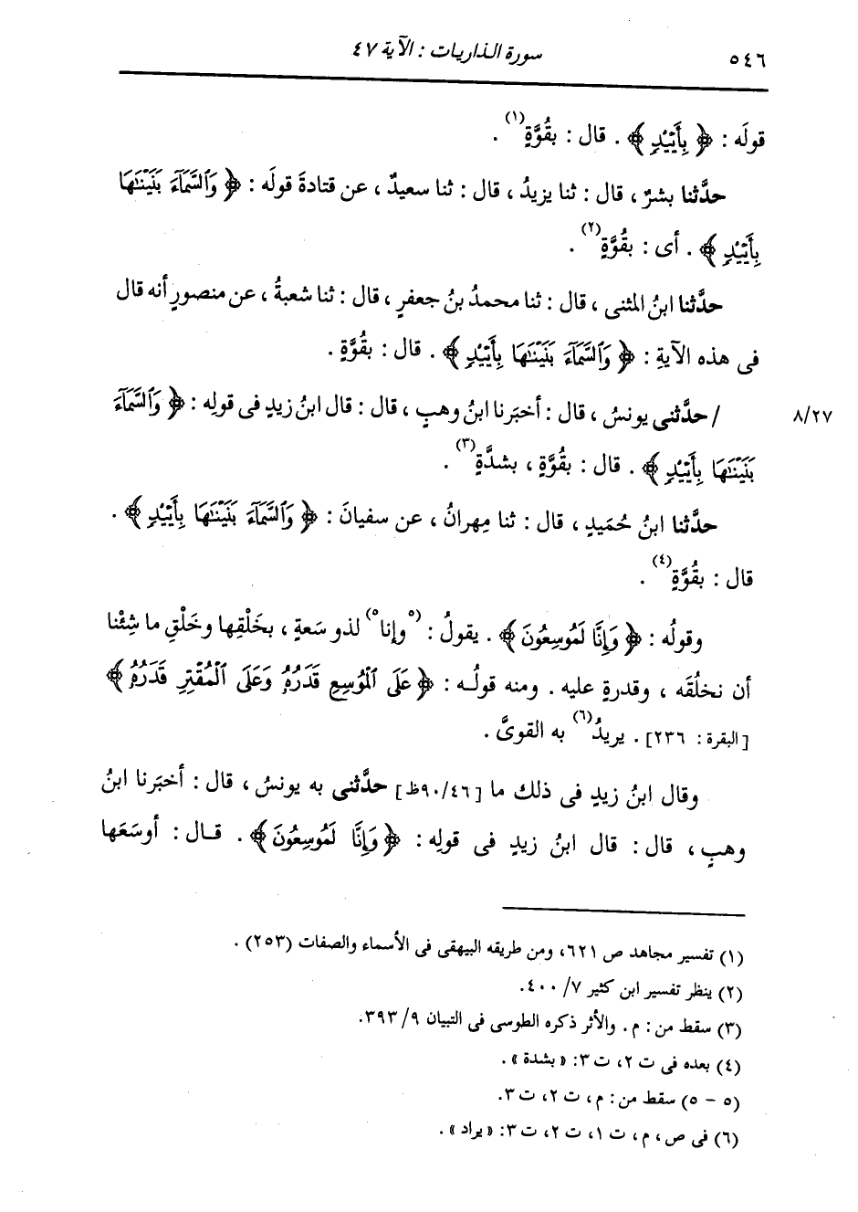 حَدَّثَنَا بِشْرٌ قَالَ: ثَنَا يَزِيدُ قَالَ: ثَنَا سَعِيدٌ، عَنْ قَتَادَةَ، {§وَالسَّمَاءَ بَنَيْنَاهَا بِأَيْدٍ} [الذاريات: 47] «أَيْ بِقُوَّةٍ»