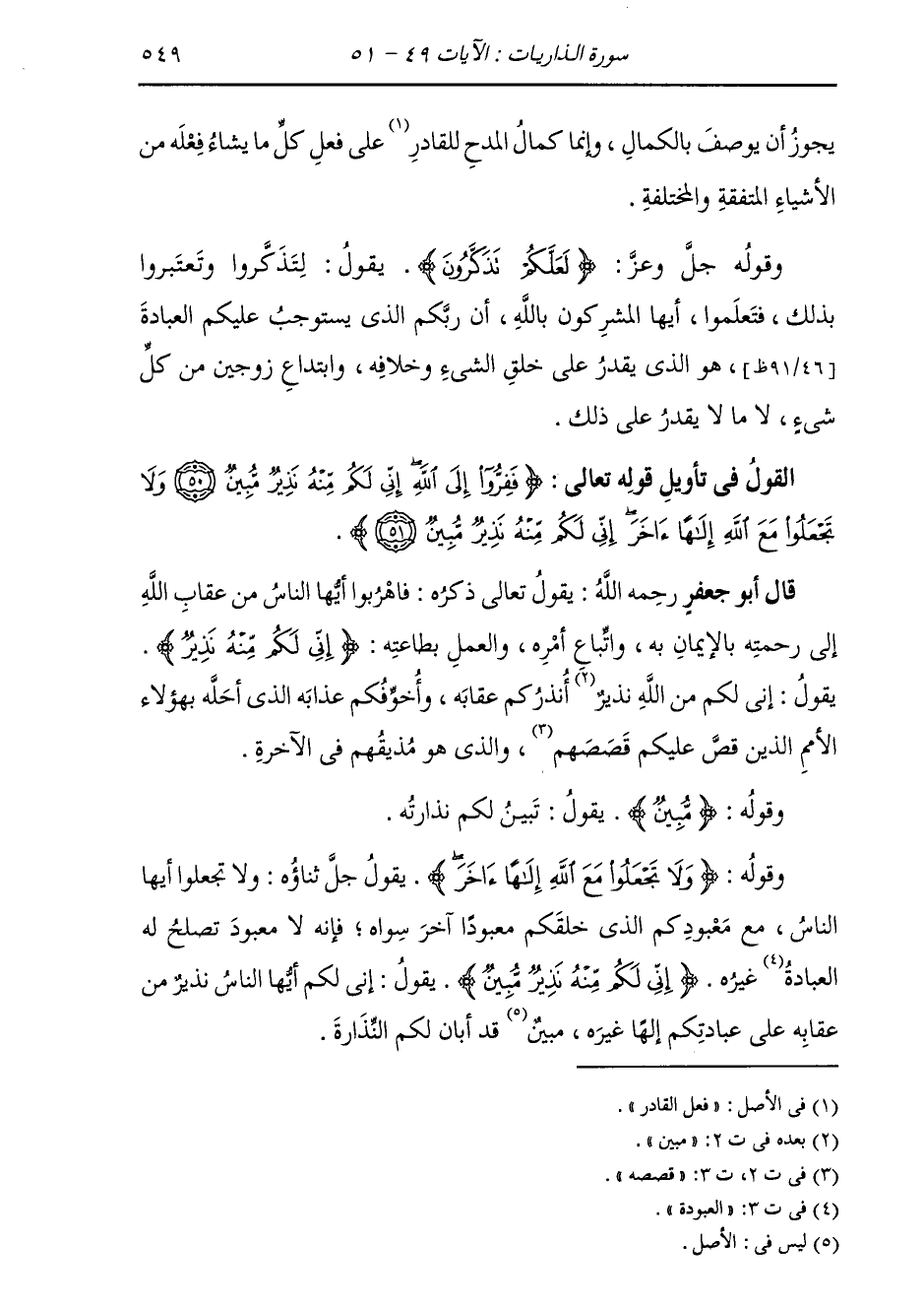 §الْقَوْلُ فِي تَأْوِيلِ قَوْلِهِ تَعَالَى: {فَفِرُّوا إِلَى اللَّهِ إِنِّي لَكُمْ مِنْهُ نَذِيرٌ مُبِينٌ وَلَا تَجْعَلُوا مَعَ اللَّهِ إِلَهًا آخَرَ إِنِّي لَكُمْ مِنْهُ نَذِيرٌ مُبِينٌ} [الذاريات: 51] يَقُولُ تَعَالَى ذِكْرُهُ: فَاهْرُبُوا أَيُّهَا النَّاسُ مِنْ عِقَابِ اللَّهِ إِلَى رَحْمَتِهِ بِالْإِيمَانِ بِهِ، وَاتِّبَاعِ أَمْرِهِ، وَالْعَمَلِ بِطَاعَتِهِ {إِنِّي لَكُمْ مِنْهُ نَذِيرٌ} [الذاريات: 50] يَقُولُ: إِنِّي لَكُمْ مِنَ اللَّهِ نَذِيرٌ أُنْذِرُكُمْ عِقَابَهُ، وَأُخَوِّفُكُمْ عَذَابَهُ الَّذِي أَحَلَّهُ بِهَؤُلَاءِ الْأُمَمِ الَّذِينَ قَصَّ عَلَيْكُمْ قِصَصَهُمْ، وَالَّذِي هُوَ مُذِيقُهُمْ فِي الْآخِرَةِ وَقَوْلُهُ: {مُبِينٌ} [البقرة: 168] يَقُولُ: يُبَيِّنُ لَكُمْ نِذَارَتَهُ
