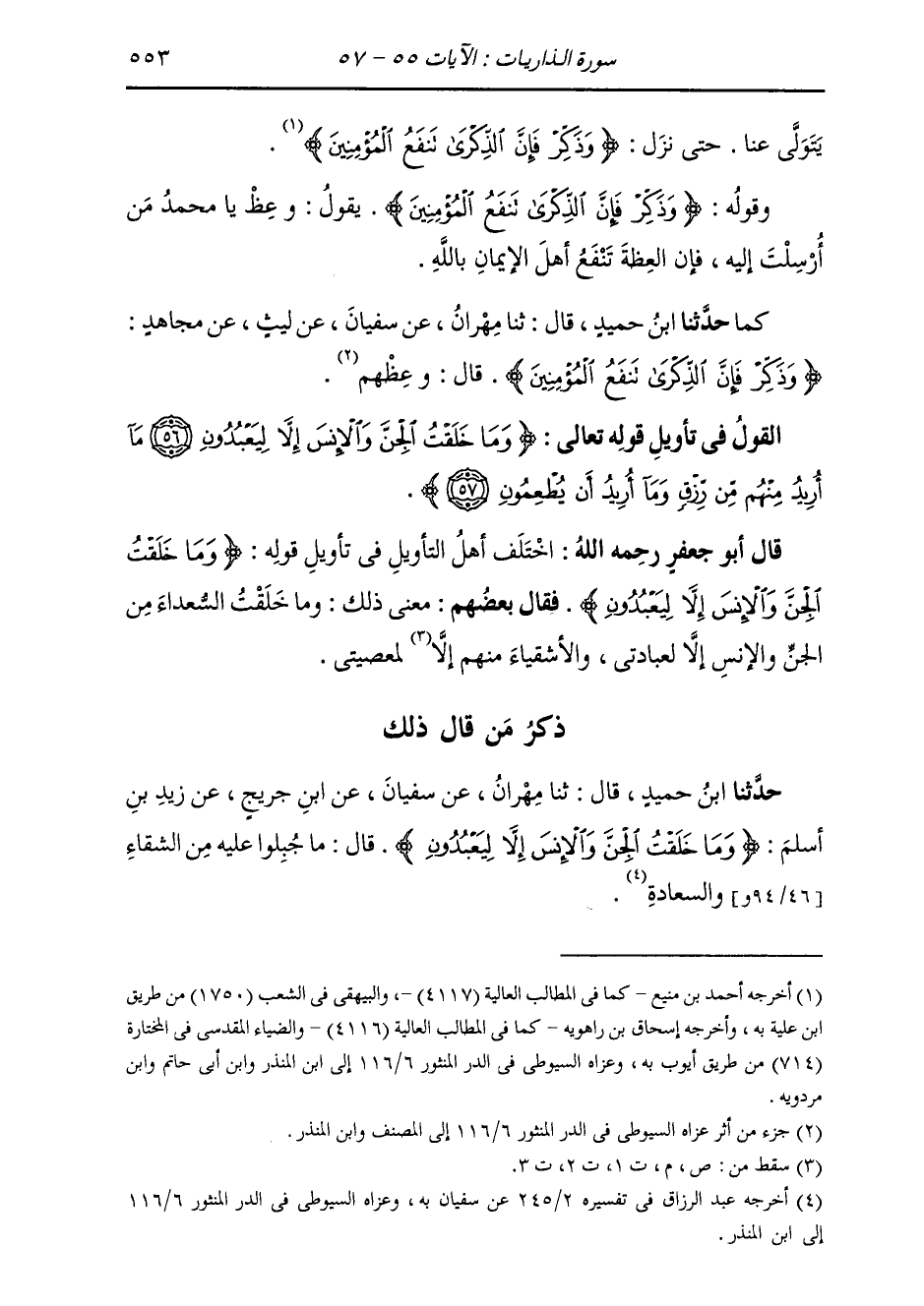 §الْقَوْلُ فِي تَأْوِيلِ قَوْلِهِ تَعَالَى: {وَمَا خَلَقْتُ الْجِنَّ وَالْإِنْسَ إِلَّا لِيَعْبُدُونِ مَا أُرِيدُ مِنْهُمْ مِنْ رِزْقٍ وَمَا أُرِيدُ أَنْ يُطْعِمُونِ} [الذاريات: 57] اخْتَلَفَ أَهْلُ التَّأْوِيلِ فِي تَأْوِيلِ قَوْلِهِ: {وَمَا خَلَقْتُ الْجِنَّ وَالْإِنْسَ إِلَّا لِيَعْبُدُونِ} [الذاريات: 56] فَقَالَ بَعْضُهُمْ: مَعْنَى ذَلِكَ: وَمَا خَلَقْتُ السُّعَدَاءَ مِنَ الْجِنِّ وَالْإِنْسِ إِلَّا لِعِبَادَتِي، وَالْأَشْقِيَاءَ مِنْهُمْ لِمَعْصِيَتِي