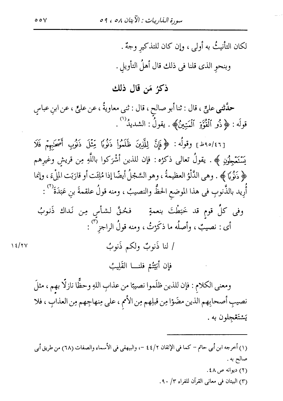 §وَقَوْلُهُ: {فَإِنَّ لِلَّذِينَ ظَلَمُوا ذَنُوبًا مِثْلَ ذُنُوبِ أَصْحَابِهِمْ فَلَا يَسْتَعْجِلُونَ} [الذاريات: 59] يَقُولُ تَعَالَى ذِكْرُهُ: فَإِنَّ لِلَّذِينَ أَشْرَكُوا بِاللَّهِ مِنْ قُرَيْشٍ وَغَيْرِهِمْ ذَنُوبًا، وَهِيَ الدَّلْوُ الْعَظِيمَةُ، وَهُوَ السَّجْلُ أَيْضًا إِذَا مُلِئَتْ أَوْ قَارَبَتِ الْمِلْءَ، وَإِنَّمَا أُرِيدَ بِالذَّنُوبِ فِي هَذَا الْمَوْضِعِ: الْحَظَّ وَالنَّصِيبَ؛ وَمِنْهُ قَوْلُ عَلْقَمَةَ بْنِ عَبَدَةَ: