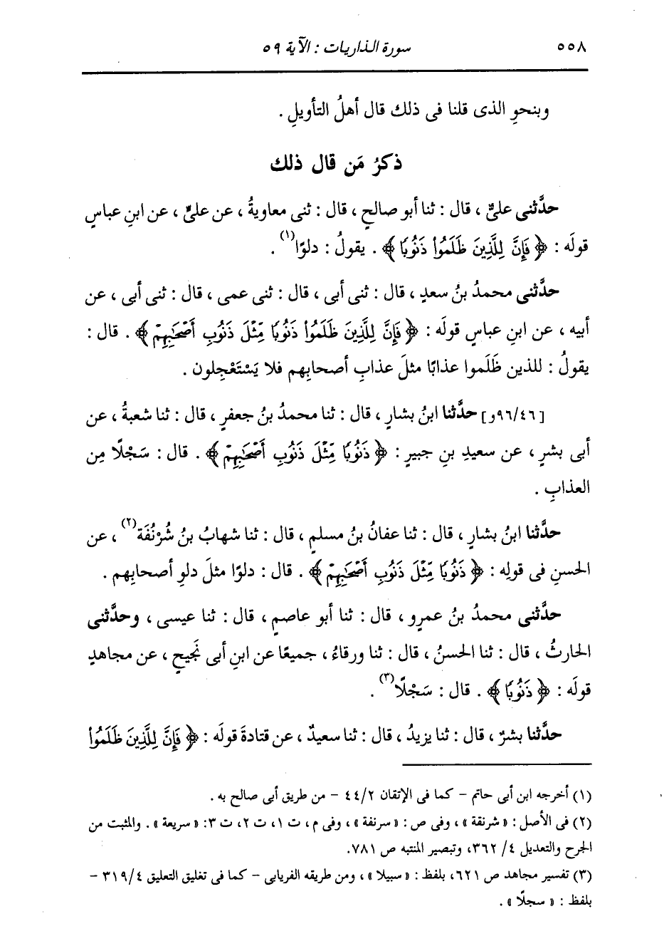 حَدَّثَنَا ابْنُ بَشَّارٍ قَالَ: ثَنَا مُحَمَّدُ بْنُ جَعْفَرٍ قَالَ: ثَنَا شُعْبَةُ، عَنْ أَبِي بِشْرٍ، عَنْ سَعِيدِ بْنِ جُبَيْرٍ، {§ذَنُوبًا مِثْلَ ذُنُوبِ أَصْحَابِهِمْ} [الذاريات: 59] فَلَا يَسْتَعْجِلُونَ: «سَجْلًا مِنَ الْعَذَابِ»